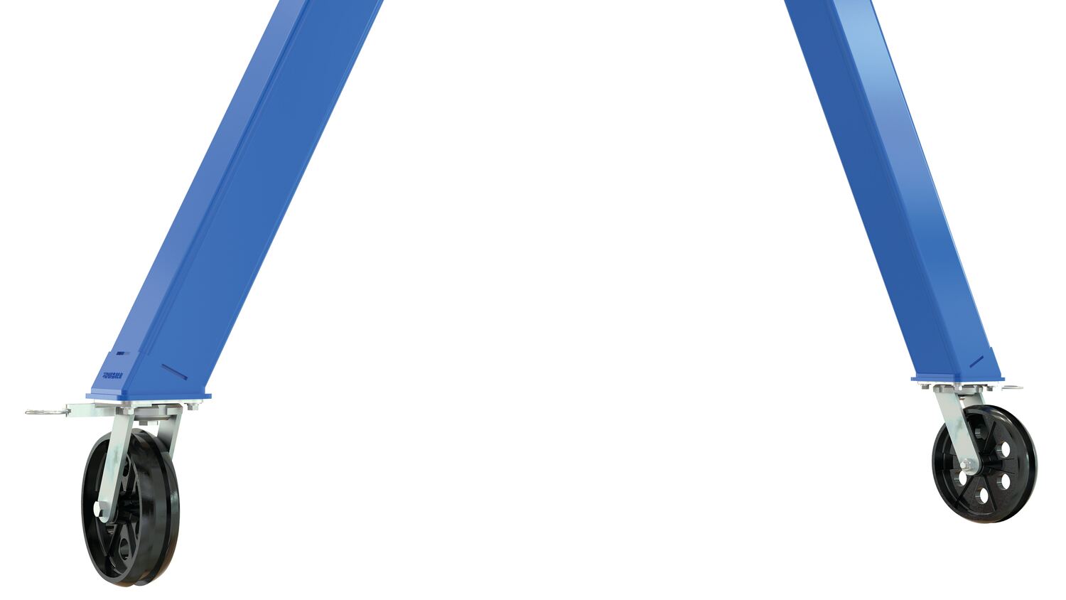 Steel Knockdown Fixed Gantry Crane with V-Groove Ductile Steel Casters 20 Ft. 4000 Lb. Capacity BlueThe fixed height knockdown industrial steel Gantry cranes are uniquely designed to be disassembled when not in use for compact storage and easier transportation / shipping from one job site to another. Facilitate easy mobility from one area to another with total locking casters. The total locking casters lock the rigging in any position and locks the wheel from rotating. Features quick setup design. Do not move units while loaded. Painted blue finish. Designed for semi-permanent or permanent applications. Requires assistance from fork truck to set-up.