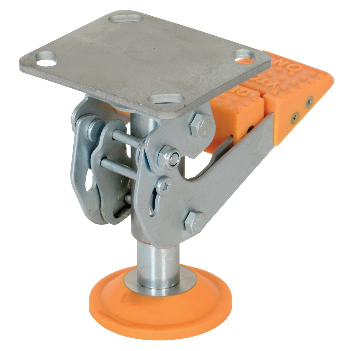 Floor locks are ideal for maintenance and construction facilities. The unit is designed to created a stable environment, while decreasing the chance of jostling or slight movement. The unit is constructed of steel with a thermoplastic polyurethane base. To use, place the unit close to a desired wheel or caster and raise until tension is built. Once secured, a simple locking device can be activated by applying pressure to the foot pedal.