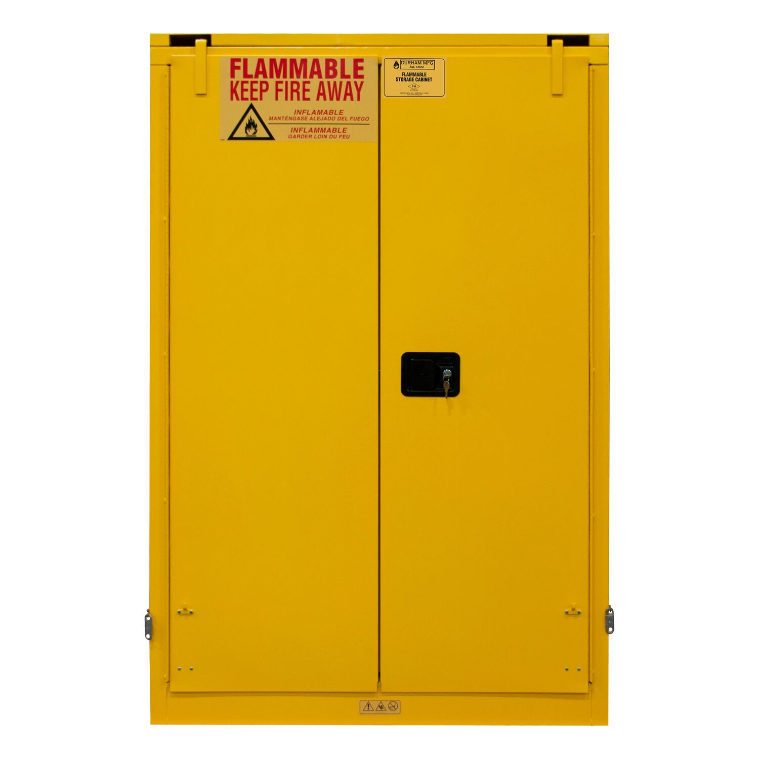 Flammable Self Closing Storage Cabinet 45 Gallon Capacity YellowKeeping dangerous items safe is always a priority. Built to help with that safety is the flammable storage cabinet. A fully welded, double wall steel construction has the durability and strength that many standard cabinets just don't have. One of the best examples of the tremendous care that goes into each and every cabinet is the grounding aid. Each cabinet is equipped with an electrical ground to eliminate any electrostatic discharge. Another often over looked feature is the two inch leak proof base. This base neatly corrals any material or substances that may have escaped their original containers. Each cabinet comes assembled and prepared to keep you and your workplace safe!