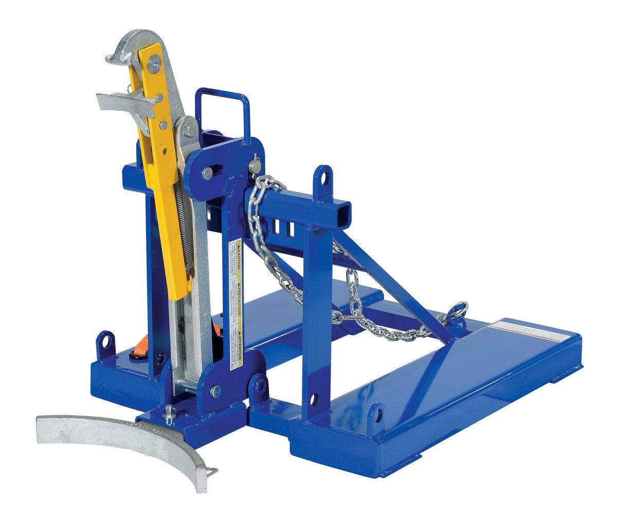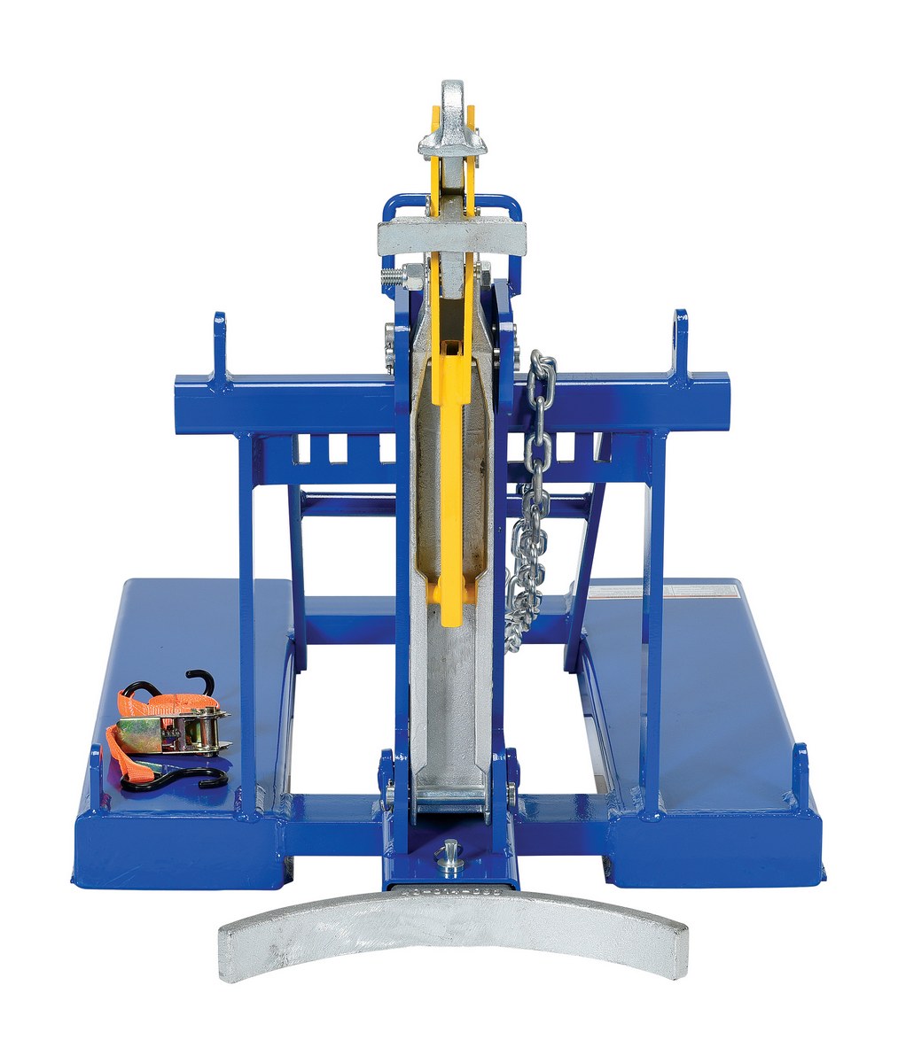 This time tested and proven automatic eagle beak Drum Lifter design allows a fork truck operator to easily secure, move, and release drums without leaving the seat of the fork truck. For use with open (lid installed and secured) and closed head steel, plastic and fiber drums with a top lip strong enough to support the weight of the drum. This unit is a single-drum configuration. Includes safety restraint to secure unit to the fork truck. A ratchet strap is supplied to secure the drum to the unit when traveling over rough terrain. Complies with OSHA 1910.178; ANSI B56.1.
