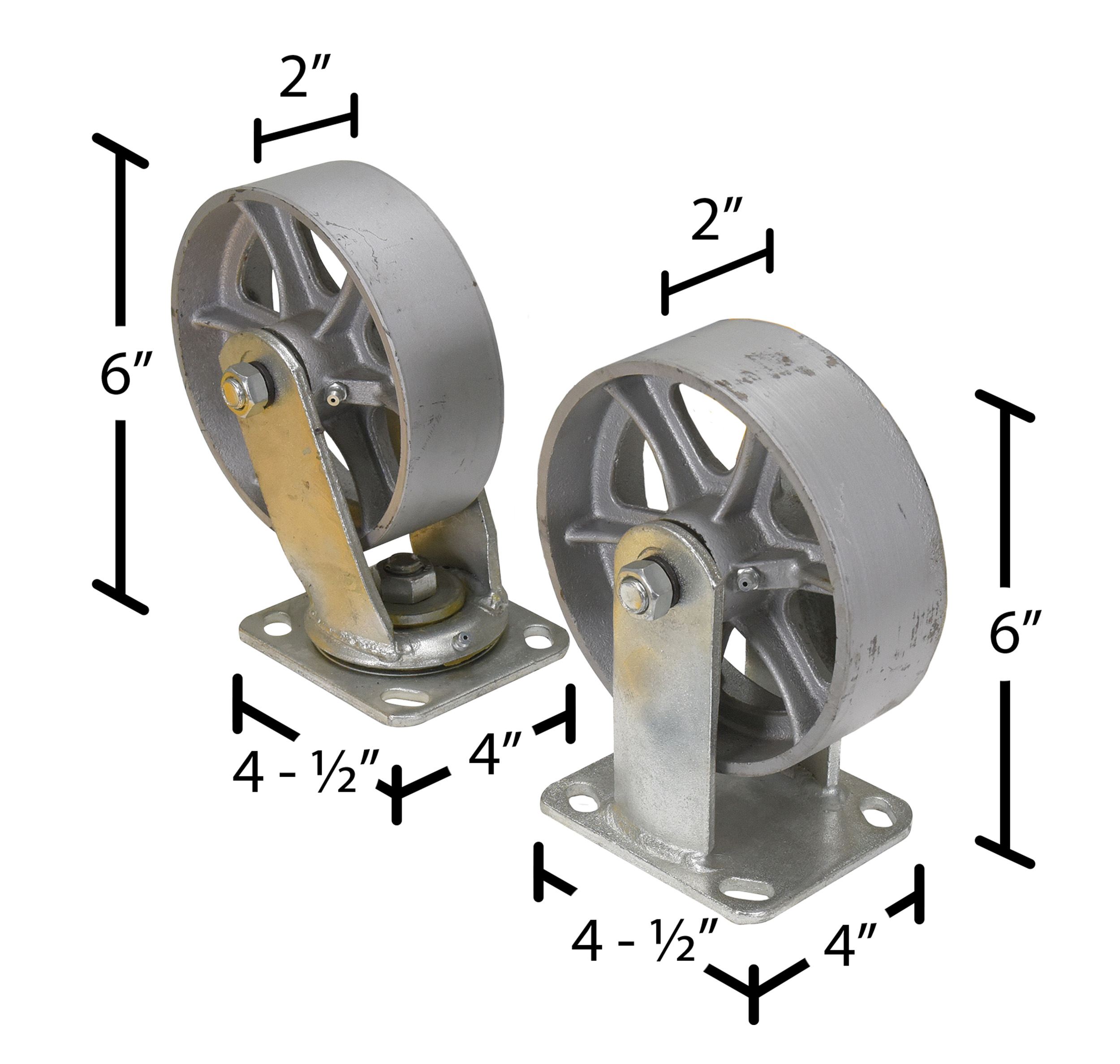 Semi Steel Caster Kit 6 In. x 2 In. 4,800 Lb. Capacity SilverCasters for the self-dumping hoppers create a more worthwhile portable unit. Casters are constructed of semi-steel for strength and durability throughout a lifetime of use. The high capacity allows the simple transport of heavy loads promoting task efficiency. Casters are bolted-on by utilizing the factory stamped hole in the fork tubes.