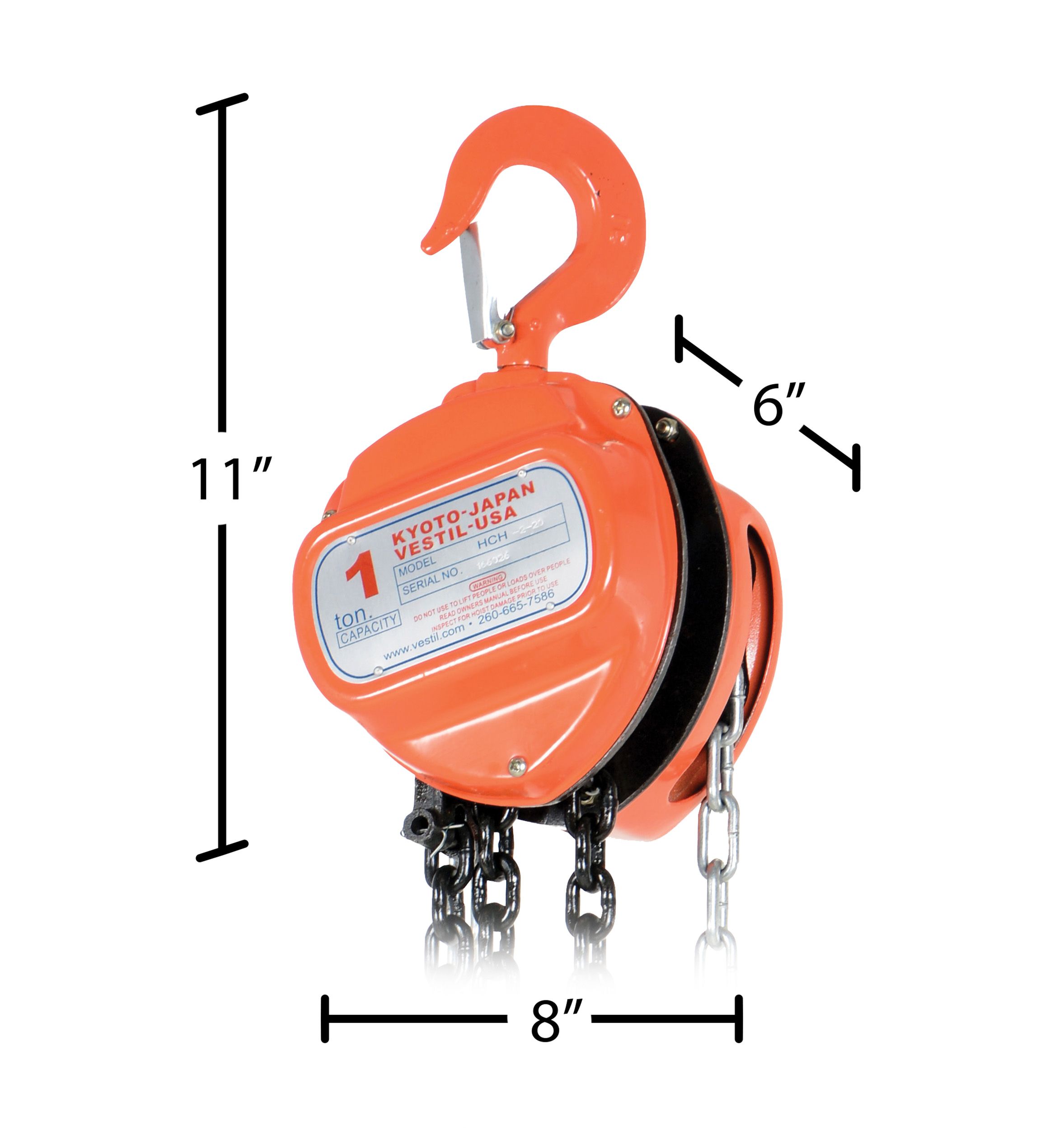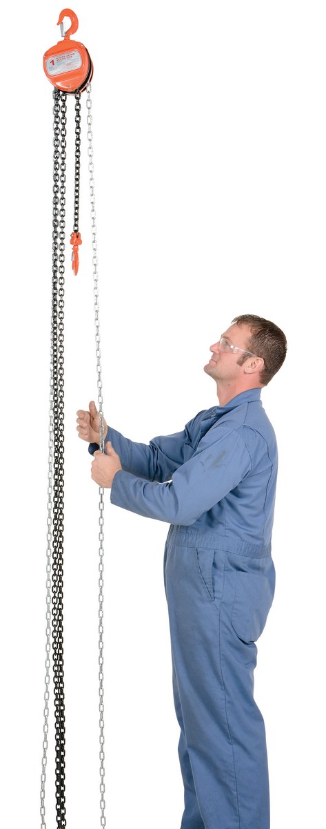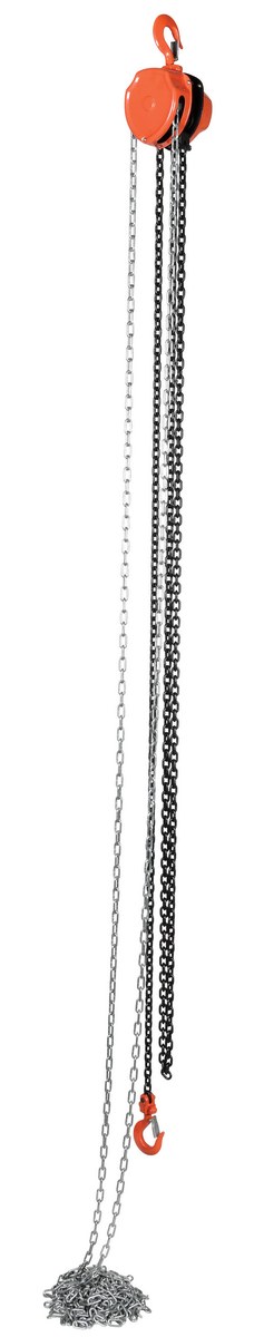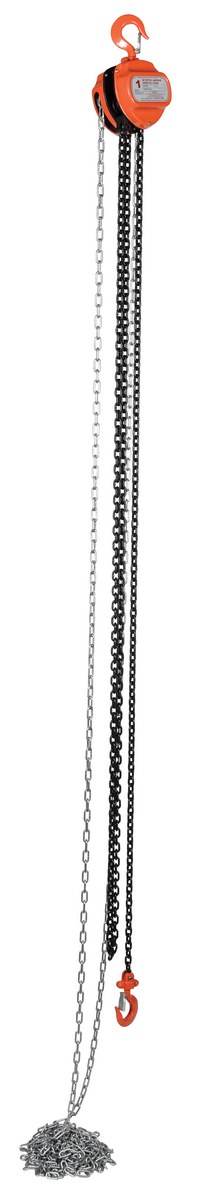 This portable, lightweight hand Chain Hoist is durable and easy to operate. Compact design and low headroom allow installation in confined areas. Enclosed double ratchet pawls with self adjusting disc brake standard. Designed with a safety factory four (4) times rated capacity. Individually tested at 150% rated capacity. Features black chain tempered to ISO 3077, pull chain, hardened two-stage gears and forged steel upper and lower hooks with safety latches. Constructed of high quality steel components ideal for industrial applications.