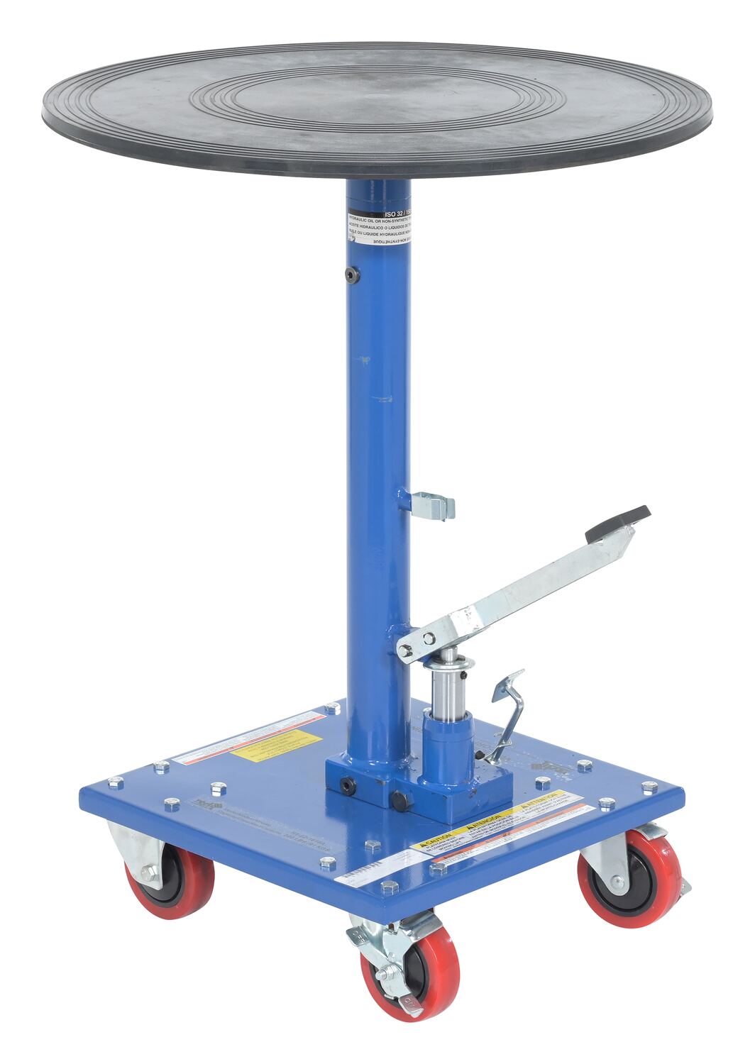Steel 24" Round Top Hydraulic Post Table 300 Lb. Capacity BlueA hydraulic post table works well in a variety of environments from lifting dies and castings to moving machine parts. The adjustable height allows the user to match their preferences with the table top. The table rolls on two swivel and two rigid casters. Brakes are included on the casters to help maintain stability during the loading and unloading process. Post table is built of steel with a powder coated finish.