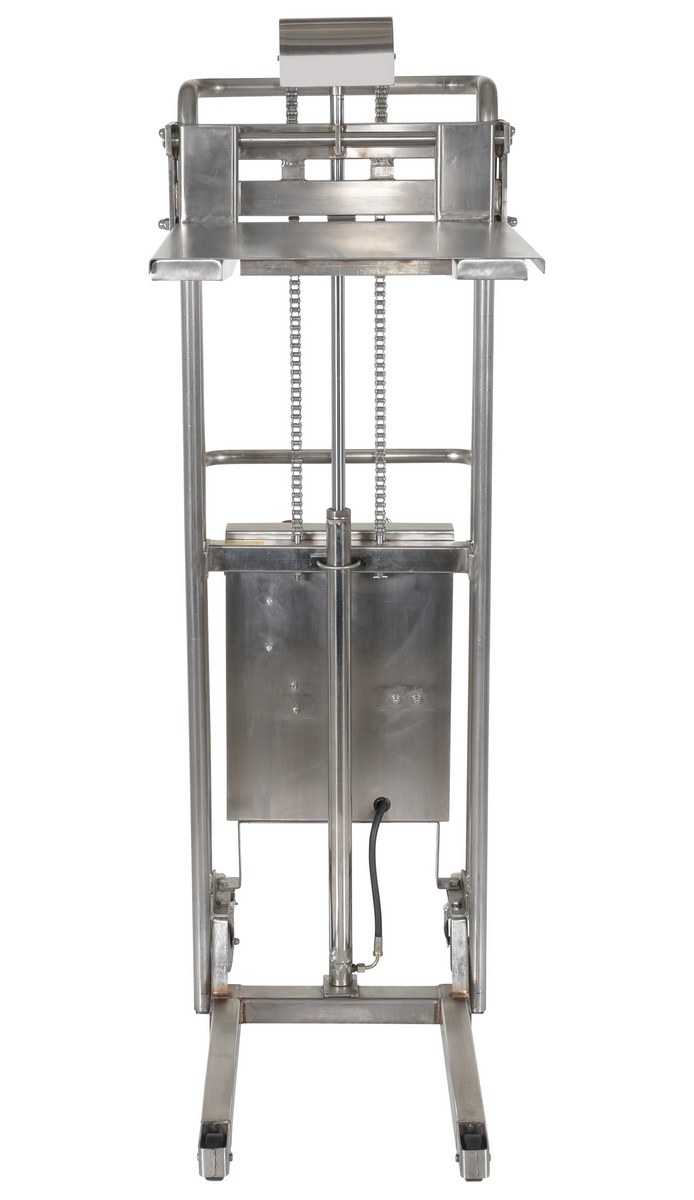 Partially Stainless Steel Portable DC Powered Hefti-Lift 44 In. x 68 In. 880 Lb. Capacity SilverThe Hefti-Lift is a user friendly, portable hydraulic lift. The lift provides reliable, power lifting when moving and positioning loads. It includes a removable platform for operation requiring forks. The non-slip chain is used for accurate positioning while the lift rolls easily on two rigid and two swivel poly-on-steel casters that includes a foot operated brake. The unit has an all welded construction with a chrome platform and uprights. Not for use with pallets.