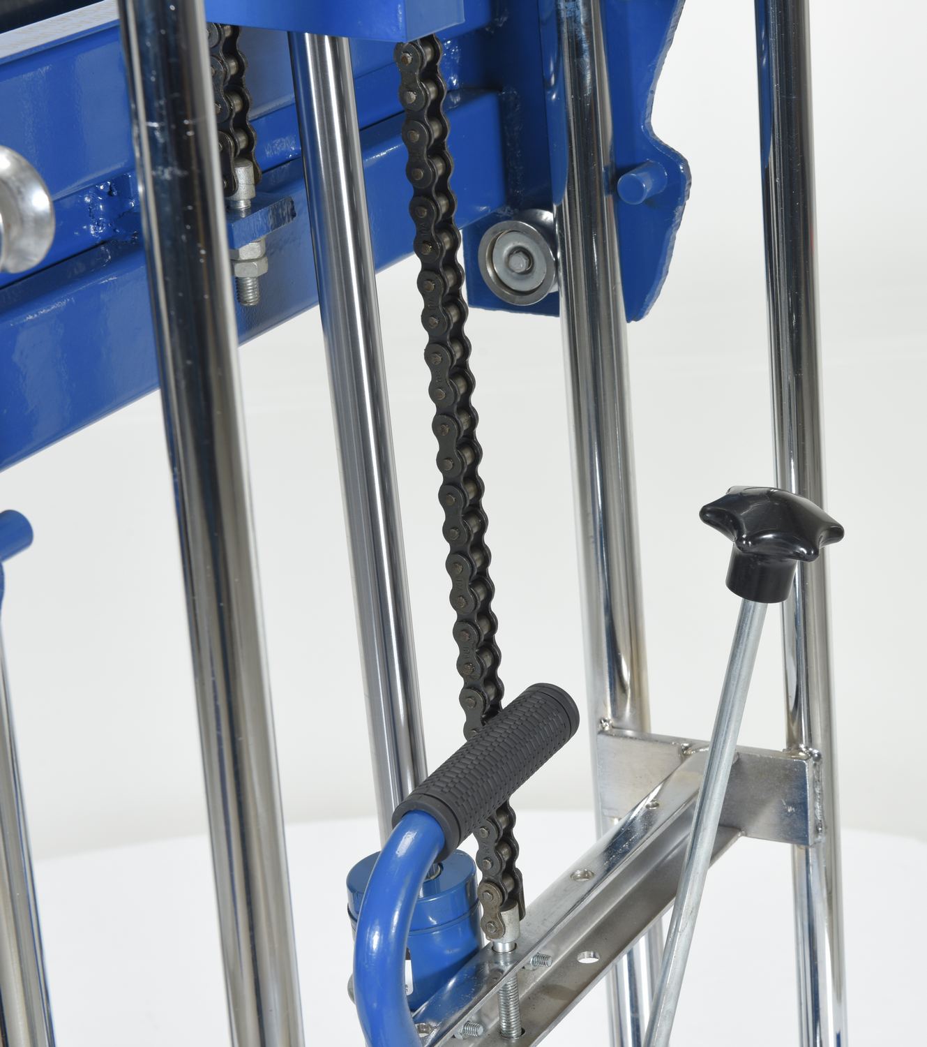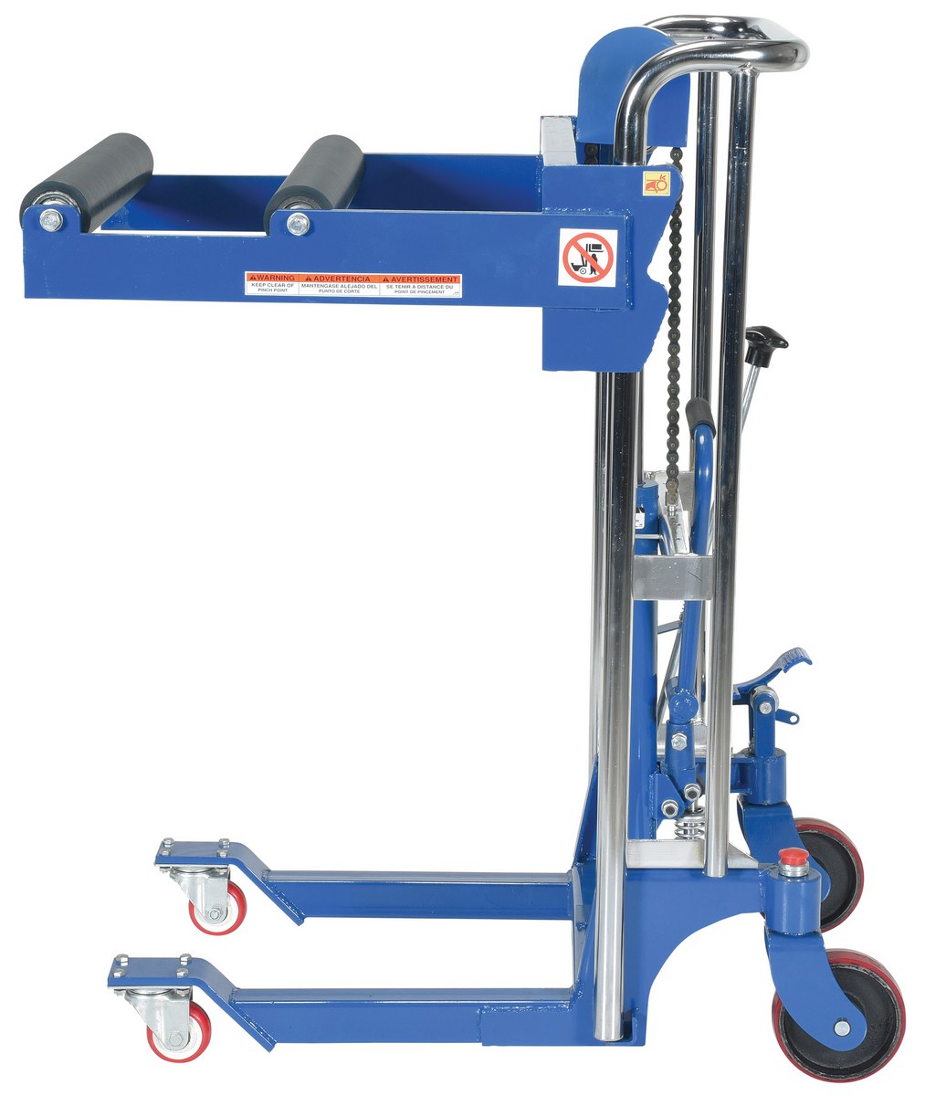 The roller work positioner is a wonderful addition to material handling and shipping facilities. The positioner allows the user to transport heavy large rolls of material with ease. The simple cradle design of the platform prevents any movement during transporting. A foot pump operation gives the user the ability to adjust the height to an exact measurement for smooth loading/unloading. The attached handle stands at an ergonomic height to diminish the chance of bending during operation. For best use, simply slide the product onto the cradle platform and use the foot pump to adjust the height that best suits the environment.