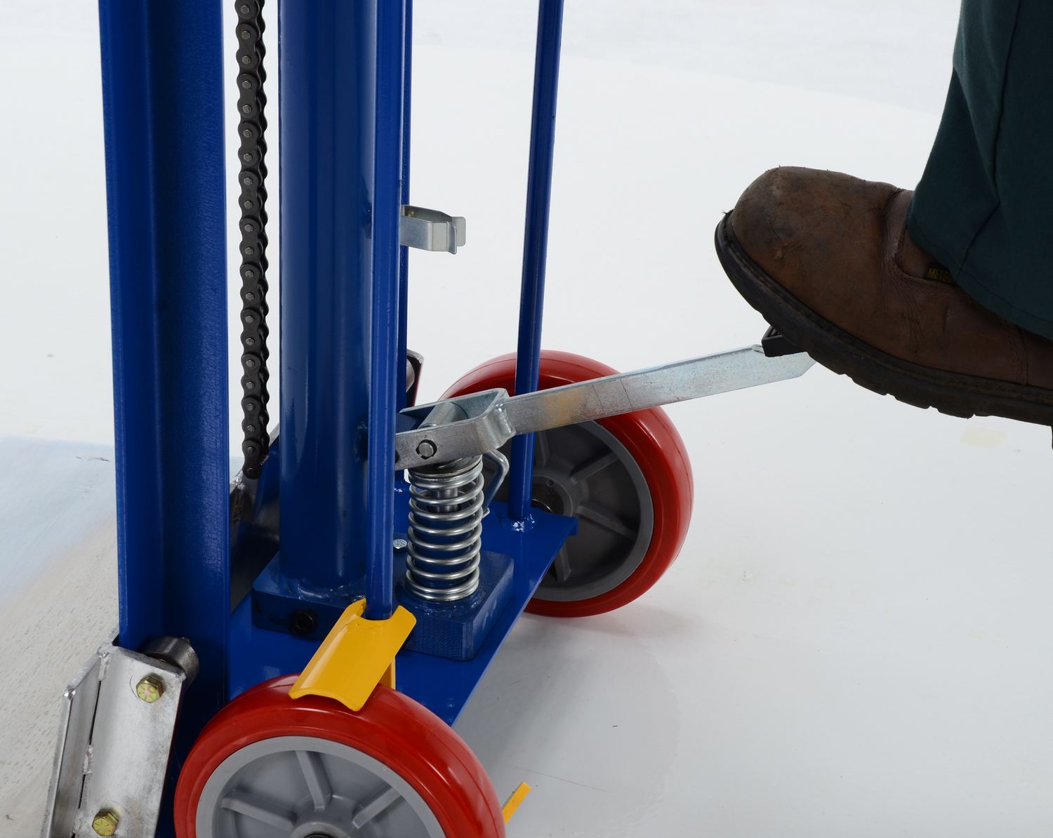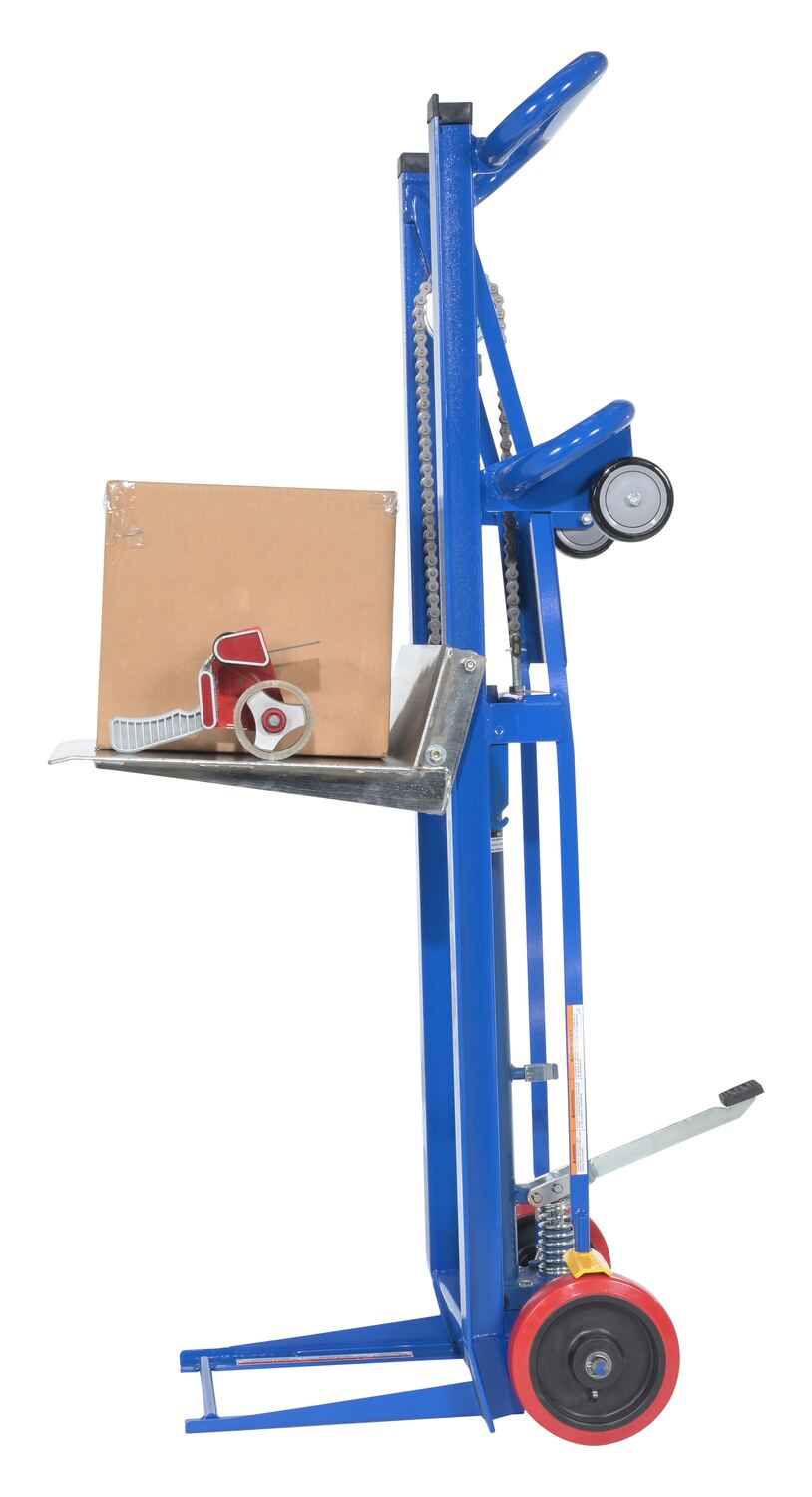 Steel Hydra Lift Cart 20 In. x 16-3/16 In. 750 Lb. Capacity BlueThe hydra cart transports loads in the lowered position and maneuver work materials to an ergonomic height, which is ideal in compact work areas. It's safe and easy for one person handling of loads and an efficient way to unload heavy objects from semi-trailers. The rugged steel construction allows for many years of service. The dependable precision built hydraulic system is activated by an easy action foot lever. The additional rollers on the handle make loading into a delivery truck easy. A single wheel brake comes standard.