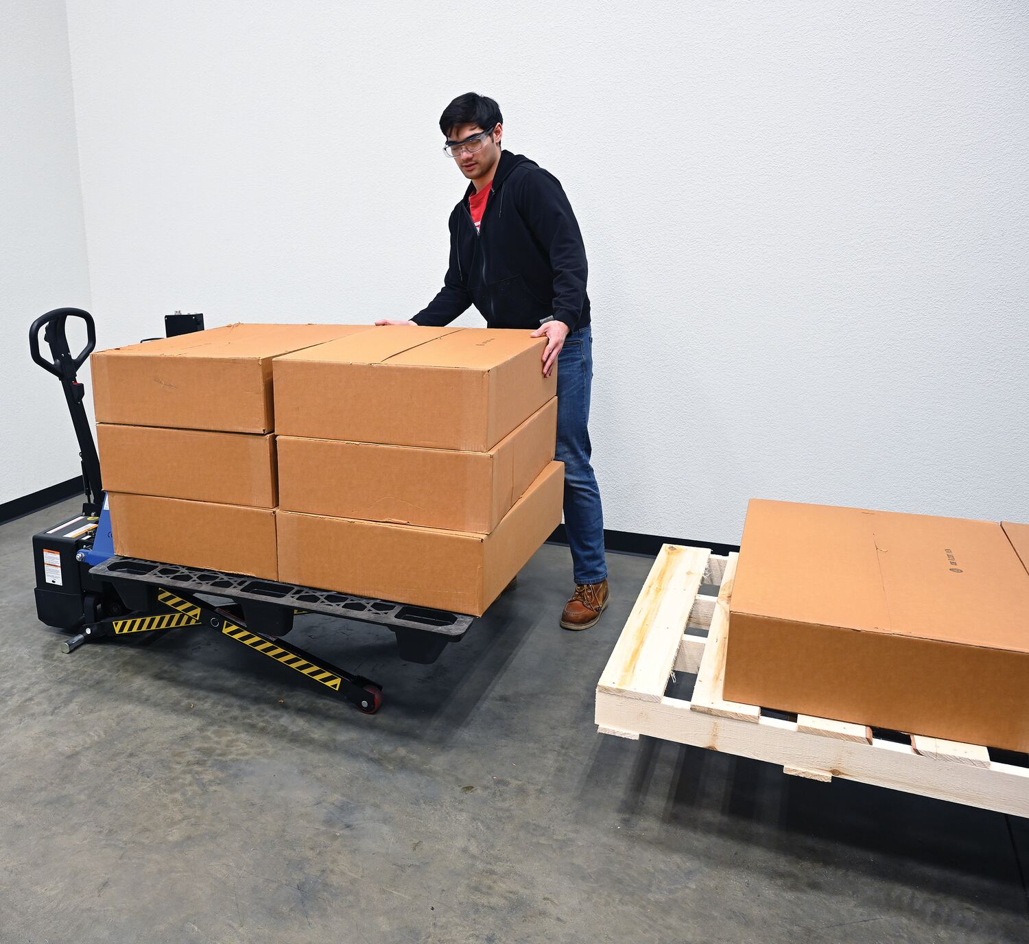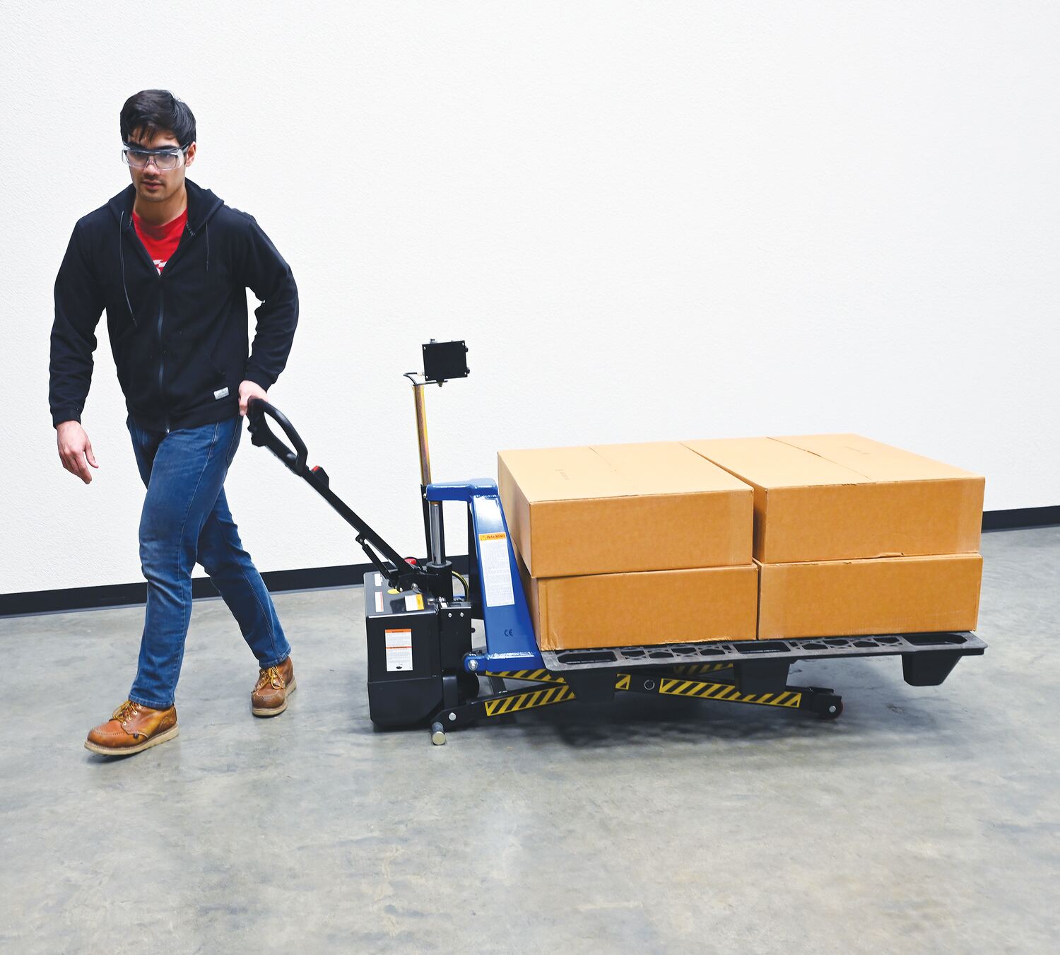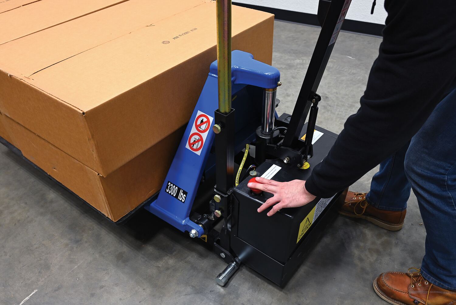 Whether your load is light, small, heavy, or large this tote lifter can manage the job! With its specifically designed structure, it is perfect for lifting open bottom skids, boxes, and baskets. Through a DC power supply, a simple rocker switch is used for raising and lowering. Not only that; but used in conjunction with the attached photo eye sensor, adjusting load heights has seldom been easier or more accurate. The photo eye sensor provides a visual representation of the tote lifters height while in the raising, lowering, or stationary process. An on-board battery charger is included to provide consistent power throughout the working day.