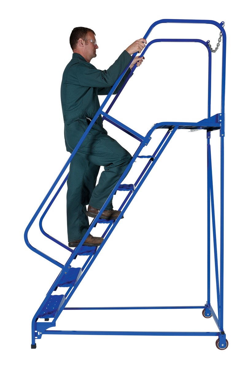 Steel Maintenance Ladder 58 Degree 7 Grip Strut 24 In. Step Width 350 Lb. Capacity BluePortable maintenance ladder for use around a variety of stores and inventory rooms. Constructed of square tubing framework, which handles uniform capacities up to 350 lbs. hand railing provides user safety while ascending or descending the unit. Distance between steps is 10". Powder coated finish for baked in added toughness.