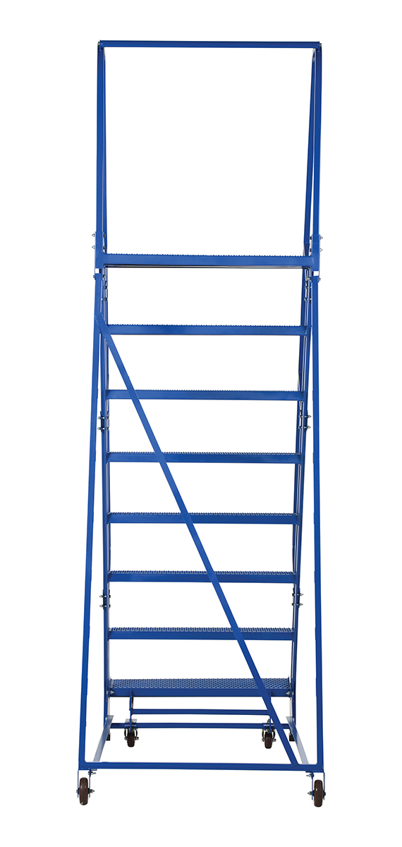 The standard slope ladder is a portable warehouse ladder for every-day use applications. Perforated steps, handrail included, welded square tubular steel construction with powder-coat blue finish. Rubber feet provided for floor protection. Unit has bottom step lock casters for safe use when climbing.