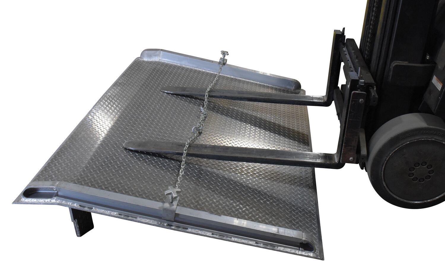 A lifting chain minimizes the manual labor associated with maneuvering heavy oversized dock boards. The chains provide a central point to be securely grasped by a lifting device, such as a fork lift. A bracket with a knob for quick hand tightening is included and can be attached to the side of a dock board to assist with the chain tightening.