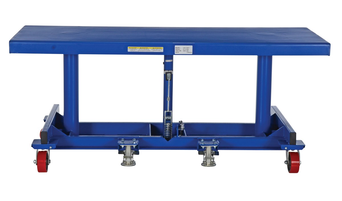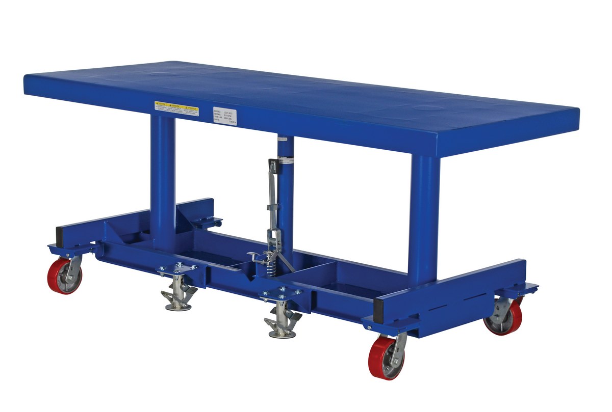 The long deck cart is perfect for sheet and strip handling, ergonomic load positioning. The platform height is adjusted with manual hydraulic foot pump. Unit comes standard with four (4) swivel poly-on-steel casters and dual floor locks.