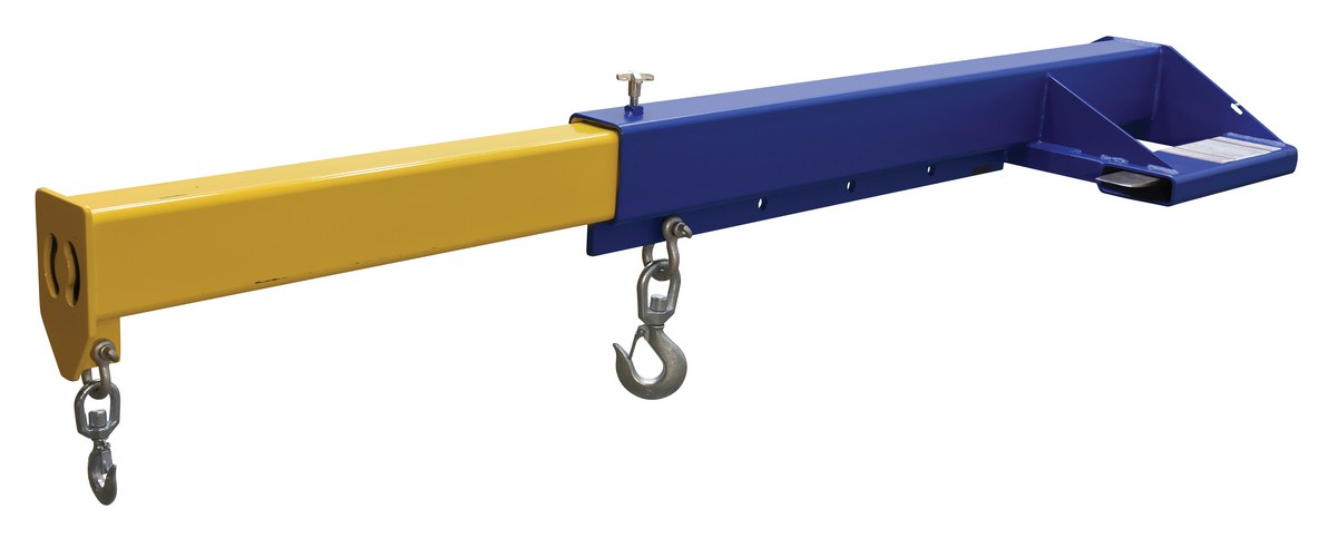 Steel Economy Telescoping Lift Boom 30 In Fork Pocket Center 8,000 Lb. Capacity Blue and YellowUnique performance, convenience, and safety features are built into every lift master boom. Fabricated from structural steel with welding to meet AWS creates a rugged and durable boom that will provide long term service. A safety restraint secures the boom to the fork truck for safe operation. Includes two (2) lifting hooks.
