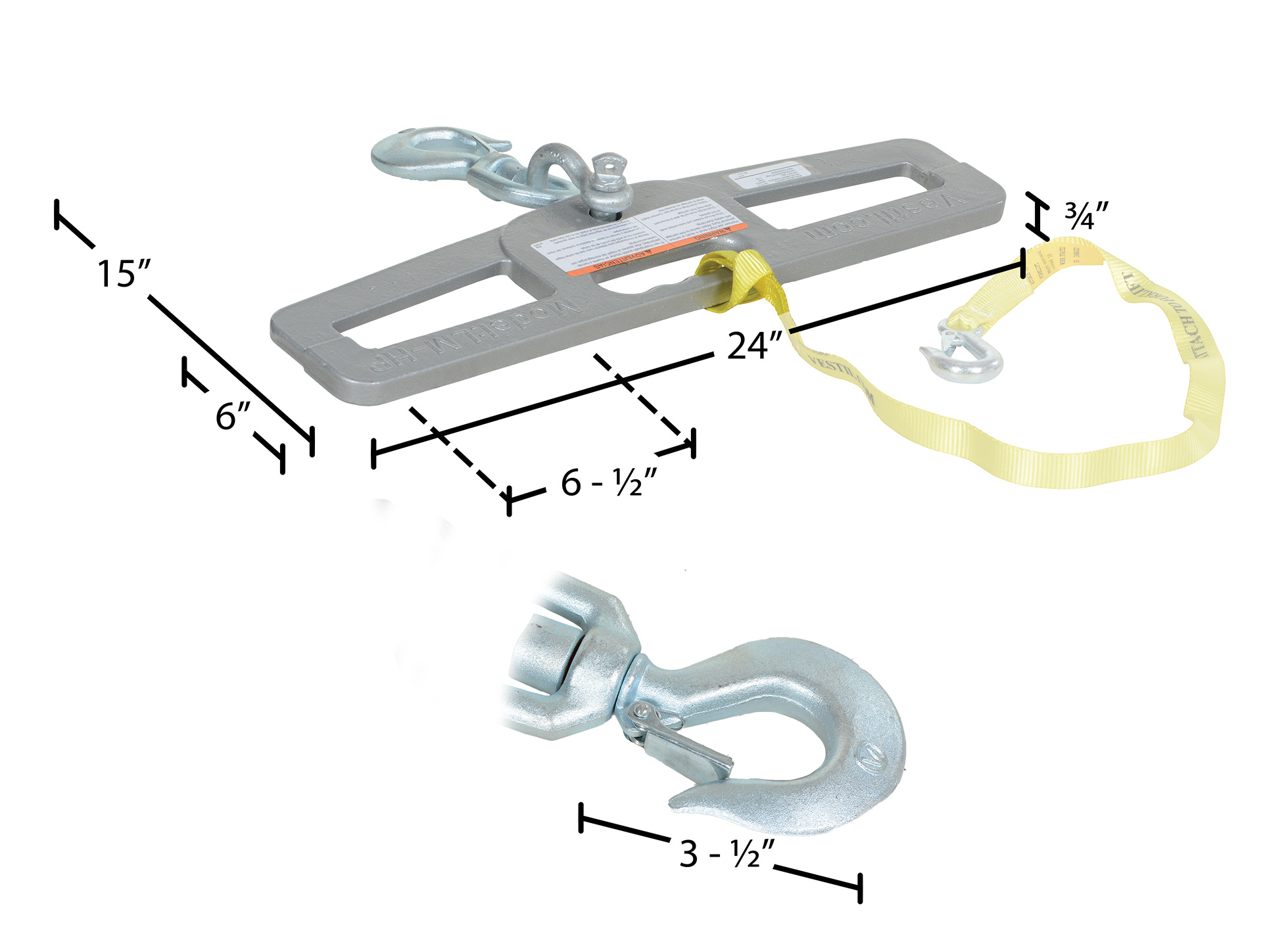 The hook plate enables any fork truck to safely lift a load using chains, cables, or slings. Features slanted fork openings to prevent the hook plate from being used upside down. A hook with anchor shackle is included.