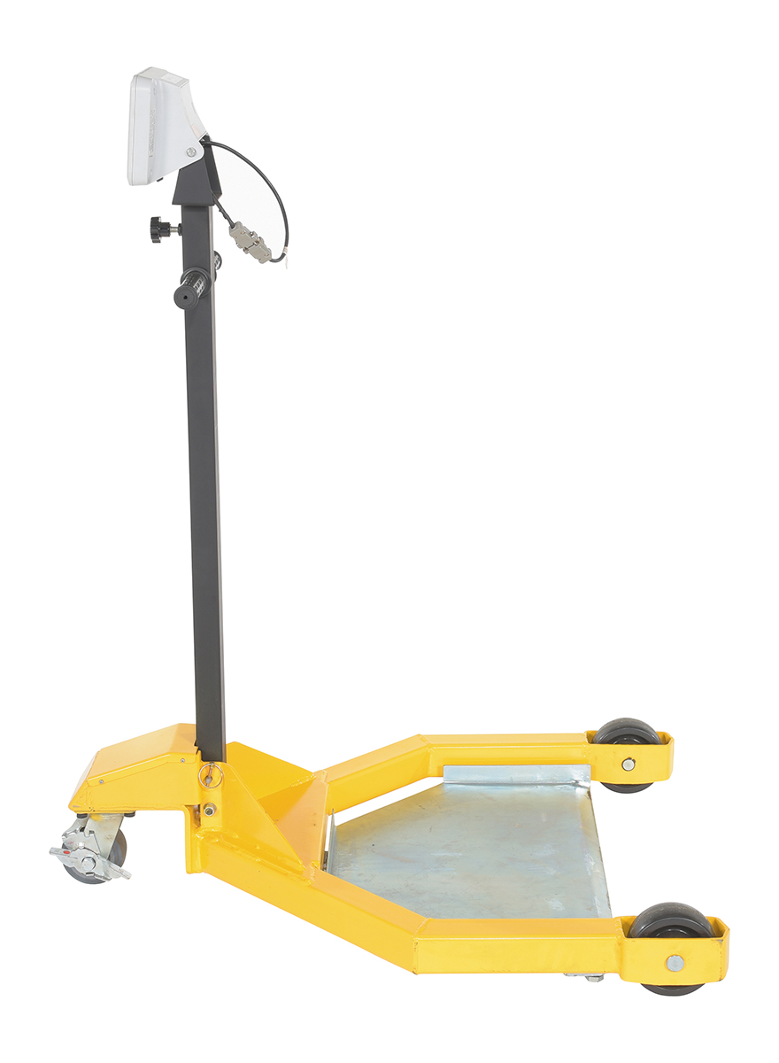 Steel Low Profile Drum Dolly with Scale 38-1/2 In. x 31-1/2 In. x 49-1/4 In. 800 Lb. Capacity Black / YellowWhy bother taking the time to weigh drums at a designated location when you can do it on the go. The low profile drum scale allows the user to weigh the drums while they are being transported. Simply maneuver the drum onto the platform and a read-out of the weight will appear on the screen located near the handle of the dolly. Powder coated black and yellow for increased toughness during daily use. Poly casters are included for simple and a smooth rolling across a variety of surfaces. When not in use, the handle folds down onto the loading platform for a simple storage.