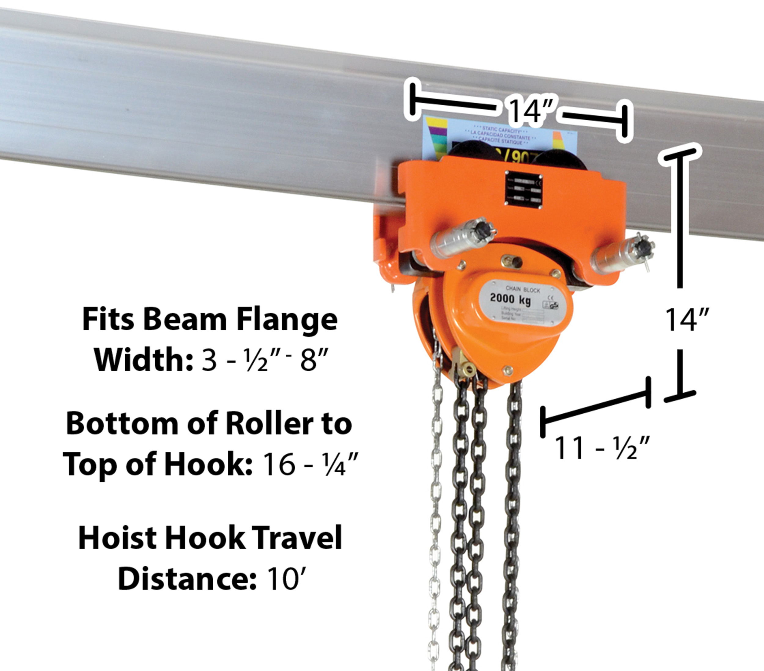 Uniform Capacity (lb.): 4,000 Fits Beam Flange Width (in.): 3-1/2 to 8 Bottom of Roller to Top of Hook (in.): 16-1/4