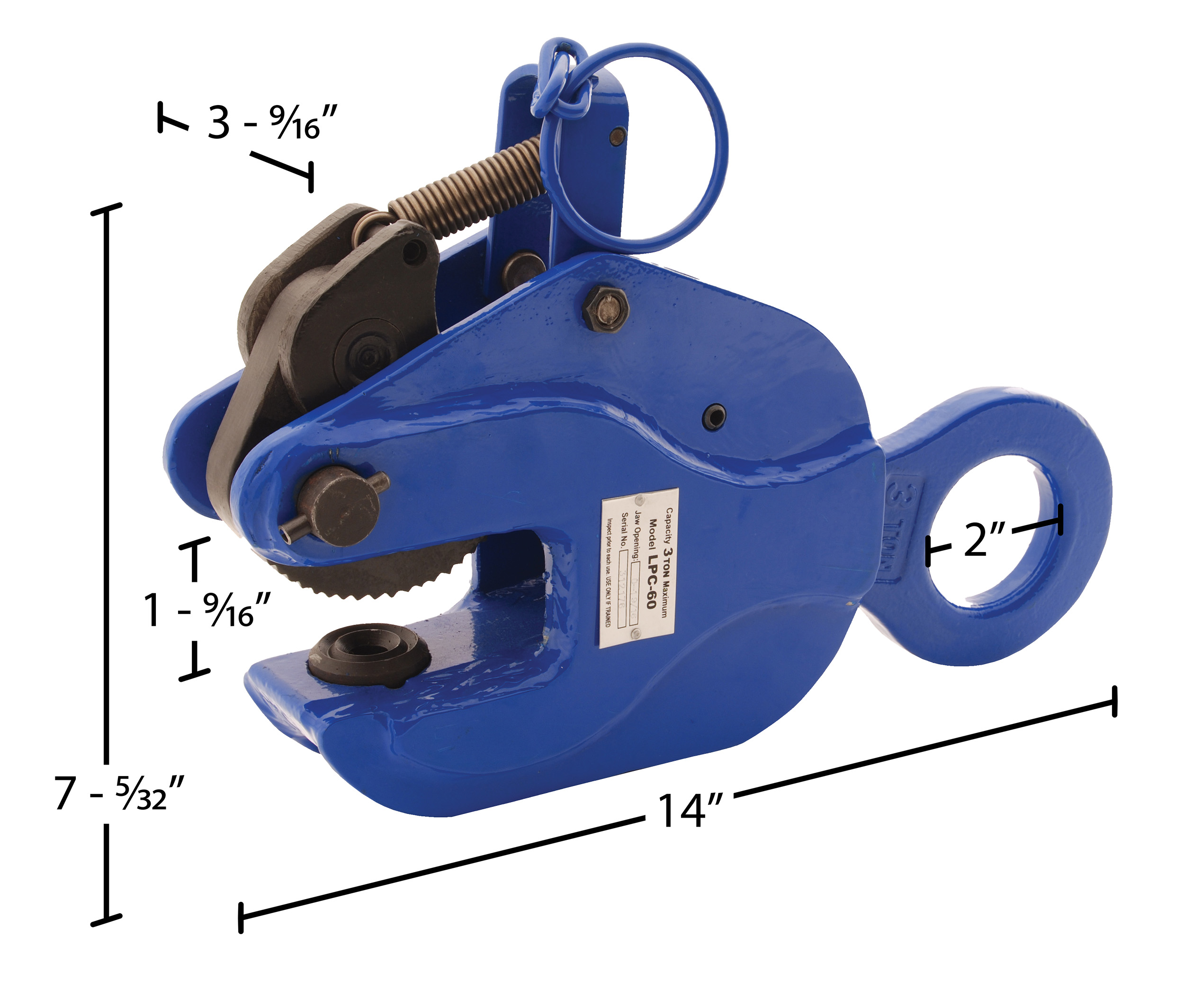 The vertical positive locking plate clamp grips a sheet until release ring is pulled. Serrated gripper is hardened tool steel. Forged head and gear. Lift only one (1) clean, oil free plate at a time. Safety factor is 2 to 1. Not designed to use on stainless steel or aluminum plates. For use with materials with a surface hardness to 30 RC (300 HB).