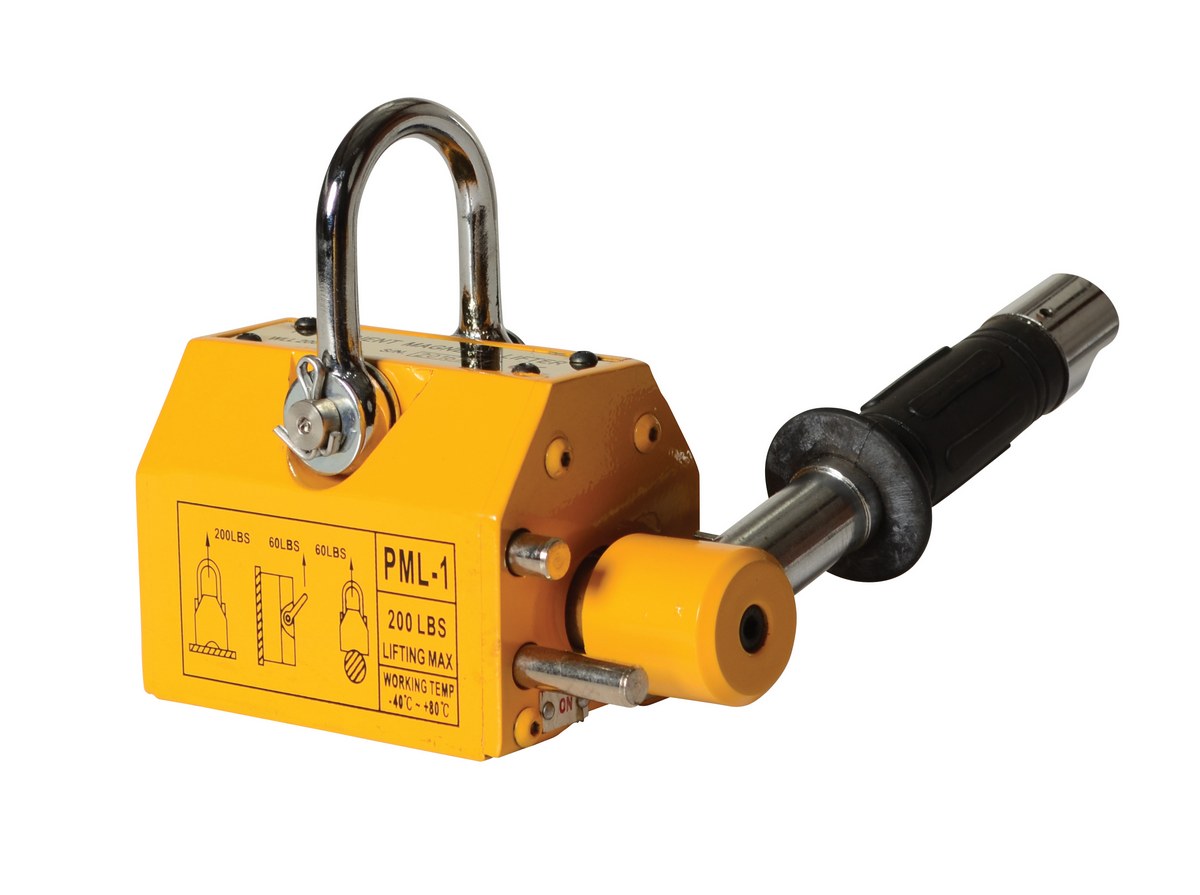 Pick up sheets of material by use of overhead crane or chain with the permanent magnetic lifter. Magnet is activated or deactivated by simply rotating the lever. Lifter is lightweight, so transporting from work area to work area is convenient.