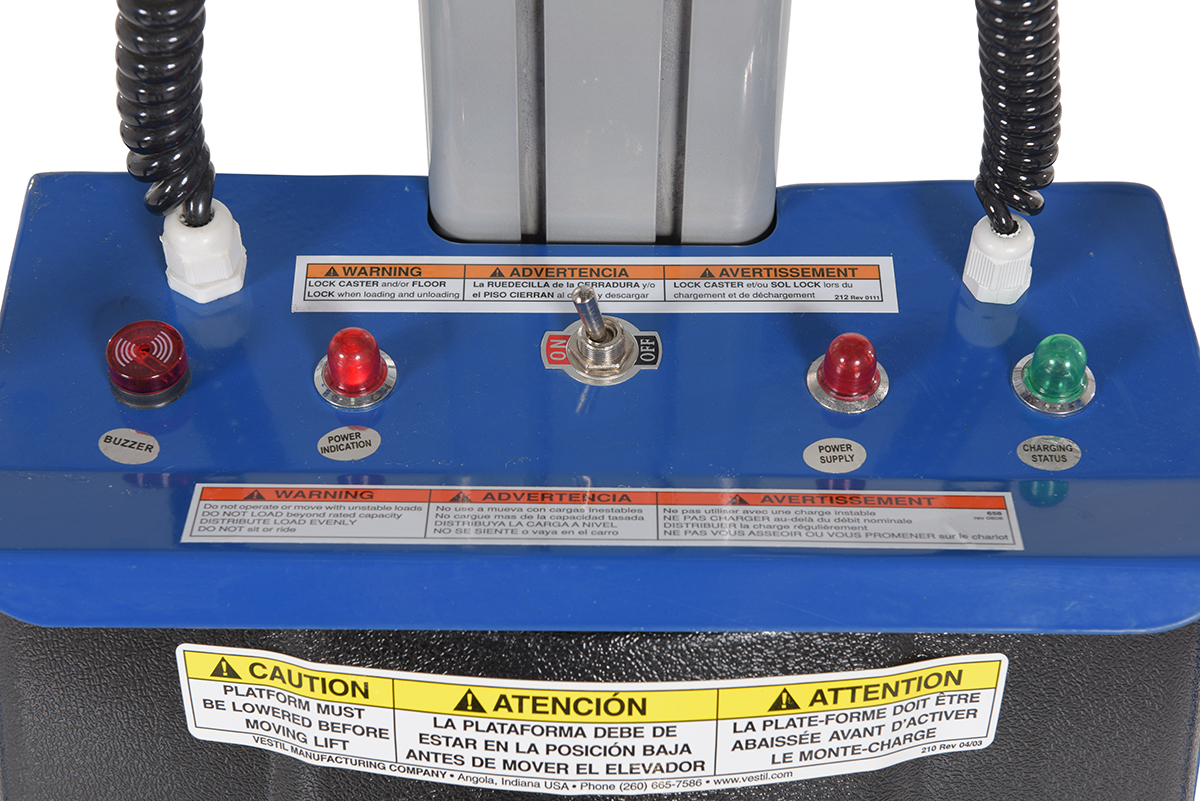 The Vestil work positioner takes the strain out of any lifting job! While many competitor models are big and bulky, the Vestil positioner is specifically built to go down narrow aisles and around confined spaces. With a platform height that is adjustable with a DC powered lift; getting to the perfect height is quick and easy. Two (2) 3" swivel load casters and two (2) 5" total locking swivel steering polyurethane casters standard. Includes two (2) 12V AGM batteries with an integral battery charger.