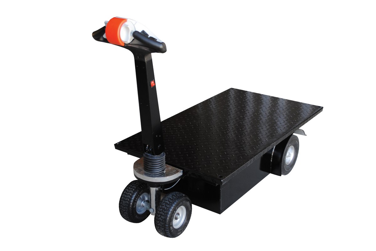 Steel Traction Drive Cart Platform 59 In. x 28 In. x 44 In. 750 Lb. Capacity BlackThis traction-drive cart features built-in traction-drive system for easy transportability. Ideal for applications including mail rooms, hospitals, supermarkets, hotels and warehouses. Features electric drive motor with batteries for power. Internal battery charger is included. Variable throttle speed control for precise maneuvering and positioning is located in the handle. Speed control is conveniently located in handle. Handle pivots back towards operator and includes horn, automatic brake and emergency stop. Each shelf includes a non-slip tread plate surface. Includes on-board charger and battery level indicator.