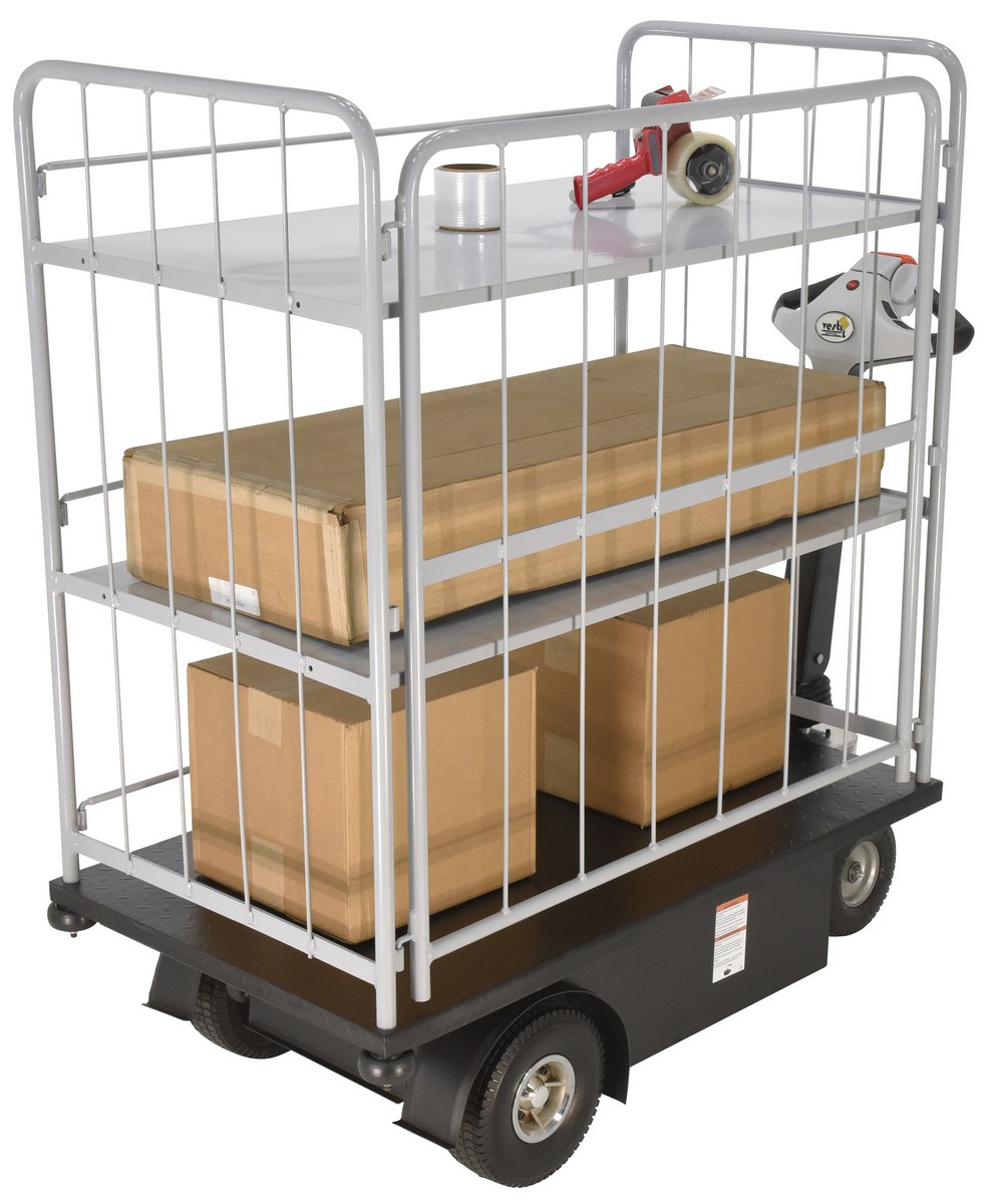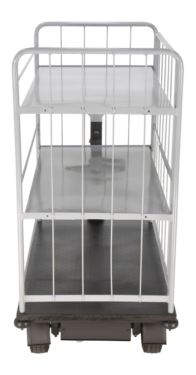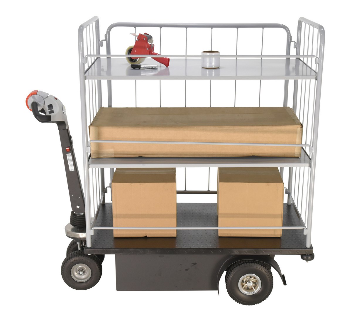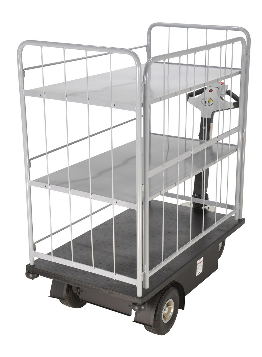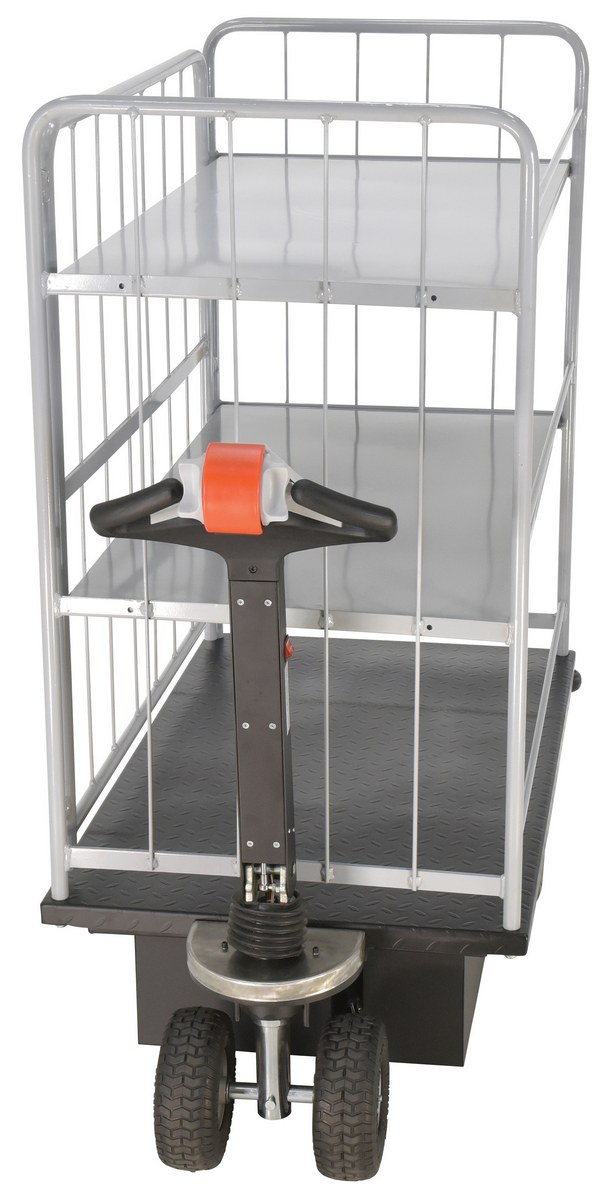 This traction-drive cart features built-in traction-drive system for easy transportability. Ideal for applications including mail rooms, hospitals, supermarkets, hotels and warehouses. Features electric drive motor with batteries for power. Internal battery charger is included. Variable throttle speed control for precise maneuvering and positioning is located in the handle. Speed control is conveniently located in handle. Handle pivots back towards operator and includes horn, automatic brake and emergency stop. Each shelf includes a non-slip tread plate surface. Includes on-board charger and battery level indicator.
