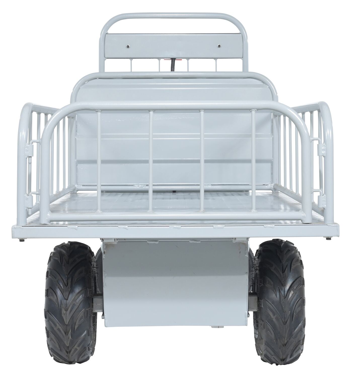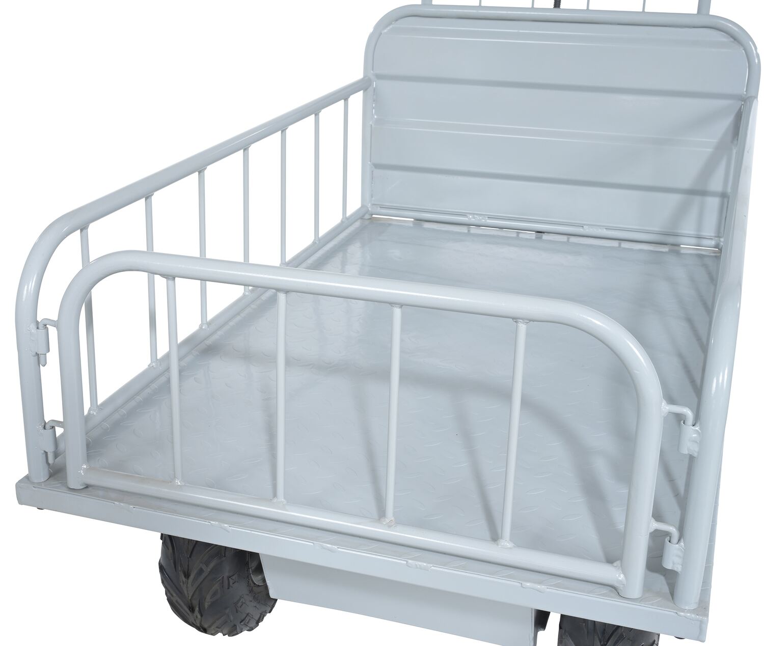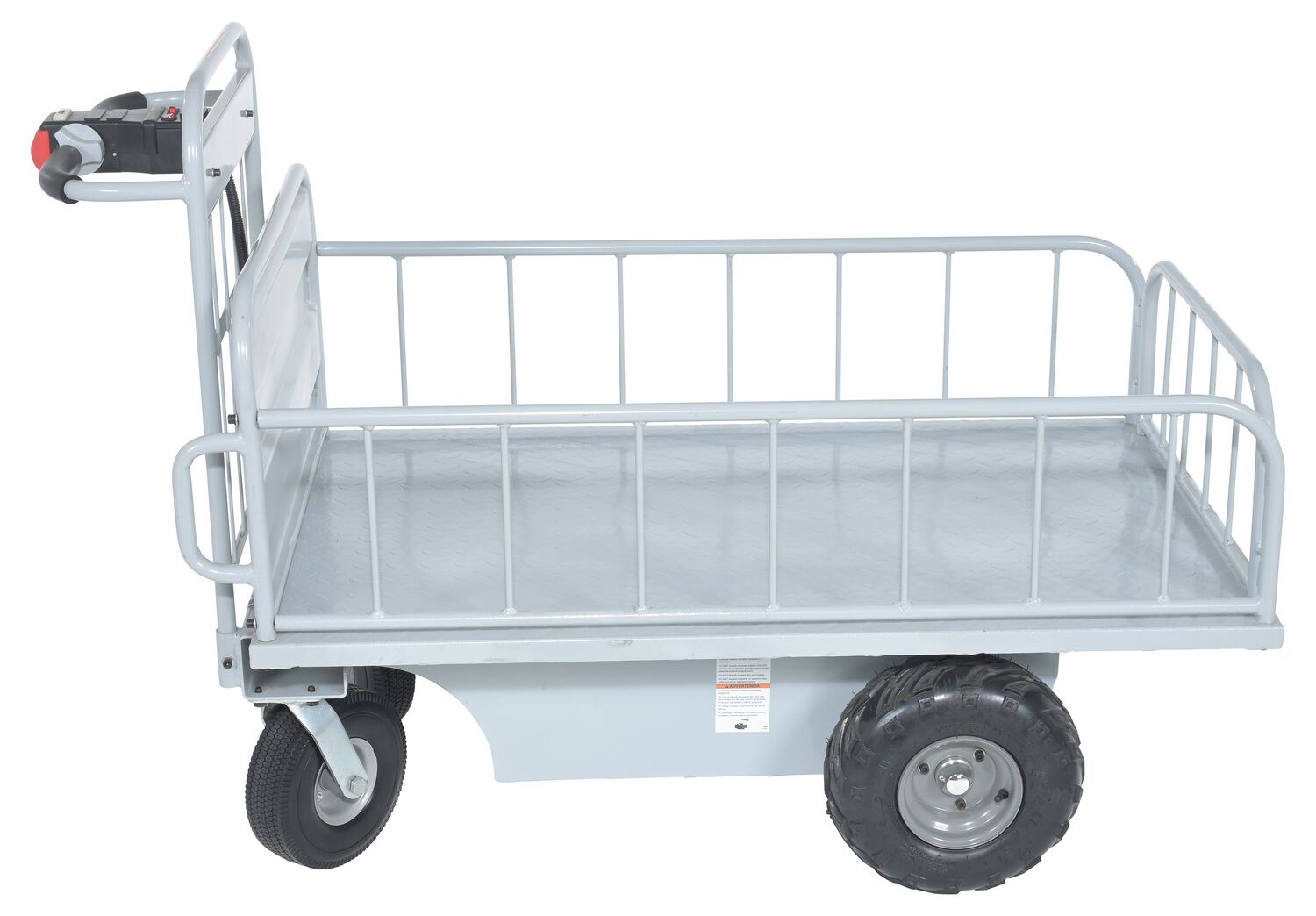 The off-road traction drive powered cart is ideal on the farm or in the factory. Forward/reverse switch. Side guards are removable.