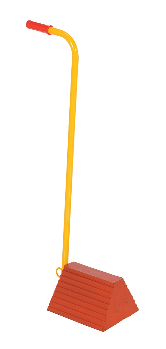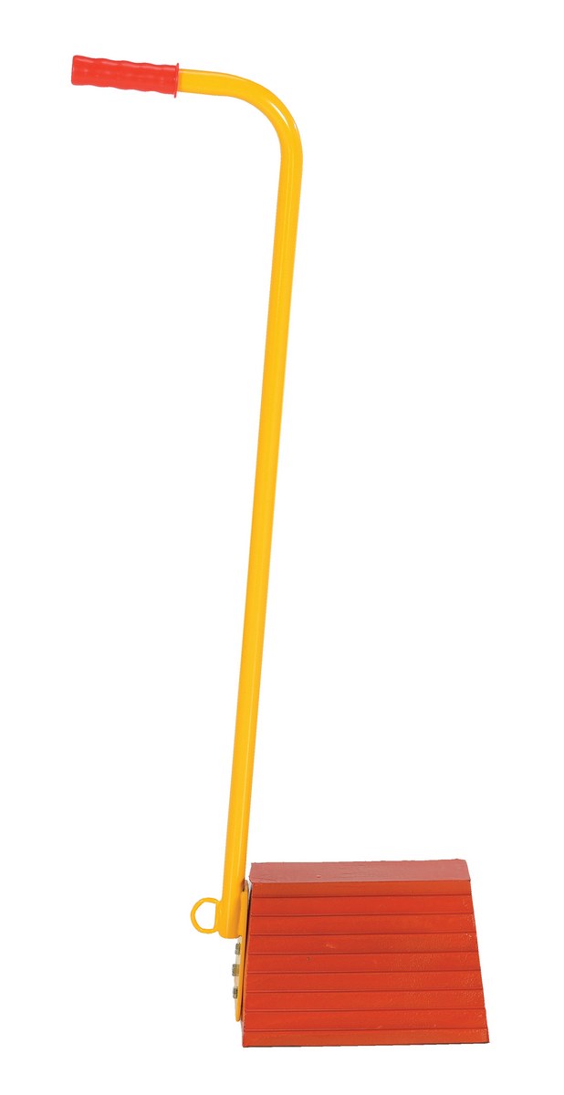 The ergo-handle Wheel Chock has an ergonomic design that makes it easy to move wheel chocks in and out of position under trailer wheels. It reduces the risk of back, knee, and foot injuries. The handle is constructed of steel and includes a yellow powder coat finish. Assembly required. D-ring provided for attaching security chain. Chain not included.