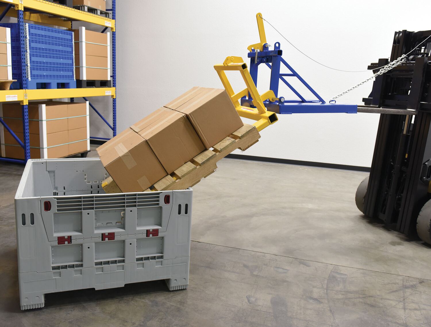 • Pallet tilts and dumps the load into a hopper or dumpster