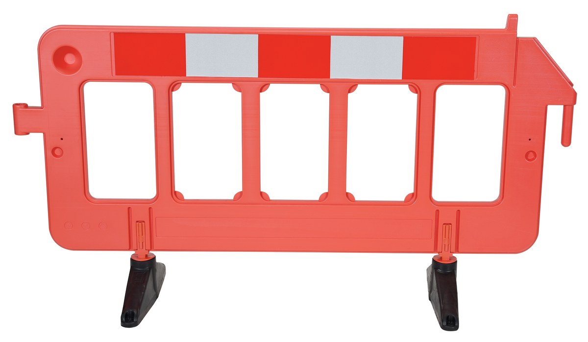 Portable barriers with removable base feet. Manufactured from virgin HDPE material and includes UV stabilizers for longer life. Reflective tape provides better identification at night. The black recycled rubber base feet are weighted for stability.