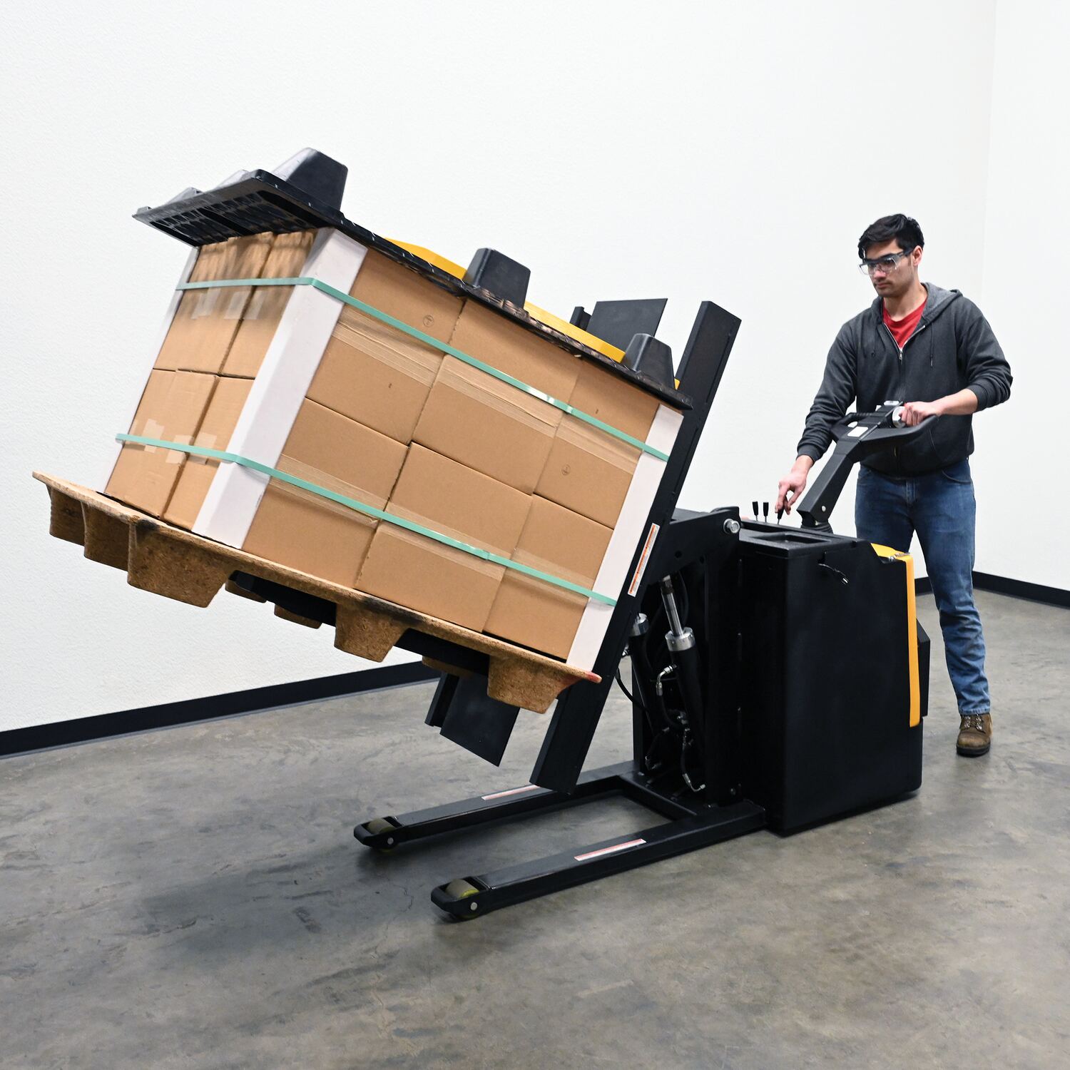 Steel Portable Pallet Inverter Low Profile 32 In. to 54 In. Fork Opening 3000 Lb. Capacity Yellow/BlackTilt (powered) and rotate (manual) loads with our durable pallet inverter. Low profile design allows the operator to stand on the rider platform and steer the load from workstation to workstation quickly and easily. DC power lift and drive makes operation safe and efficient. The ergonomic handle features easy to operate throttle with infinite forward and reverse speeds, tilt/lower controls, safety belly reverse button, and horn. Features an electromagnetic disc brake with automatic dead-man feature that activates when user releases handle. Includes (4) 6V batteries, an on-board battery charger, battery level gauge, emergency battery disconnect, and horn. Ideal in loading dock areas as a powered pallet truck, powered pallet tilter, or as a manual turntable. Rolls smoothly on polyurethane steer and load wheels.