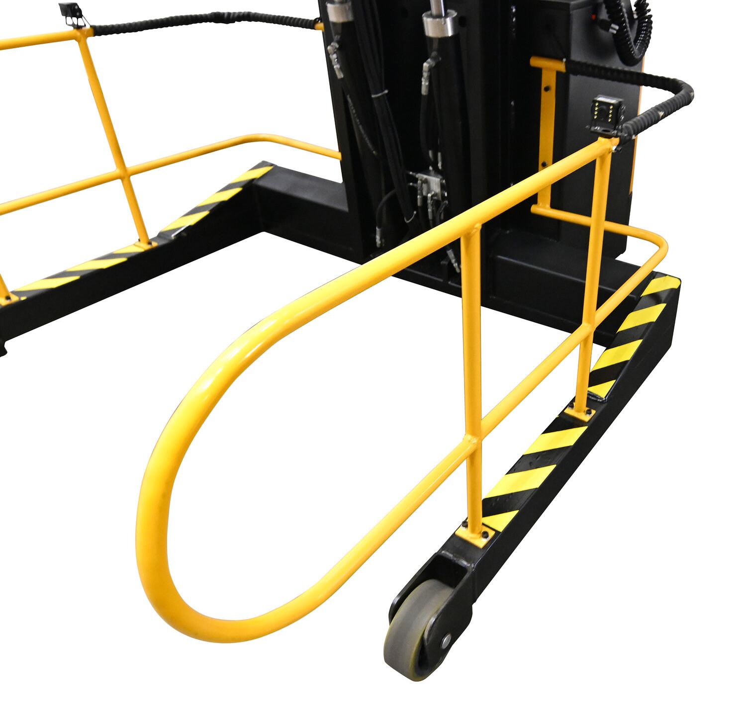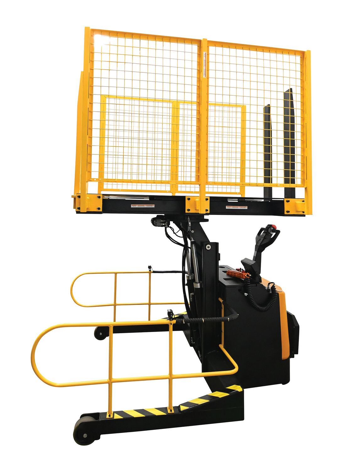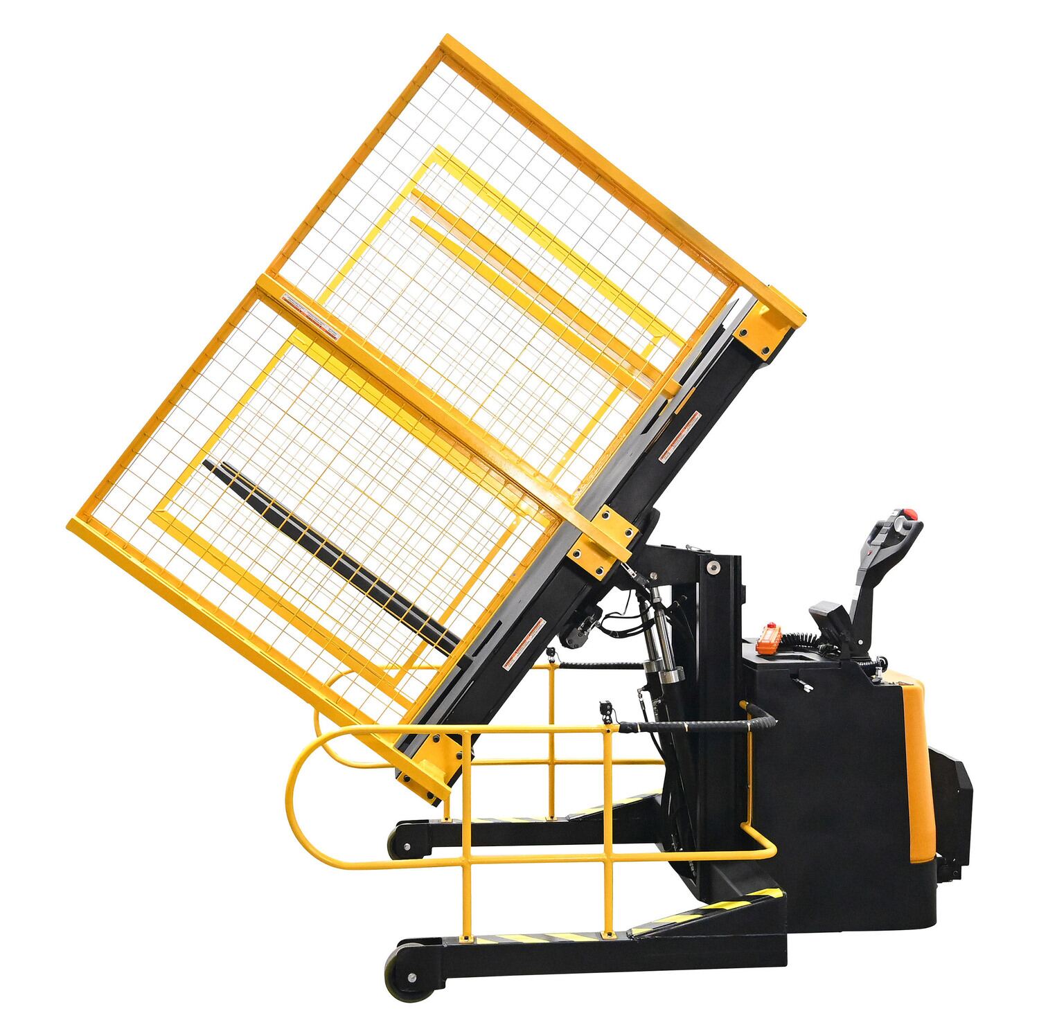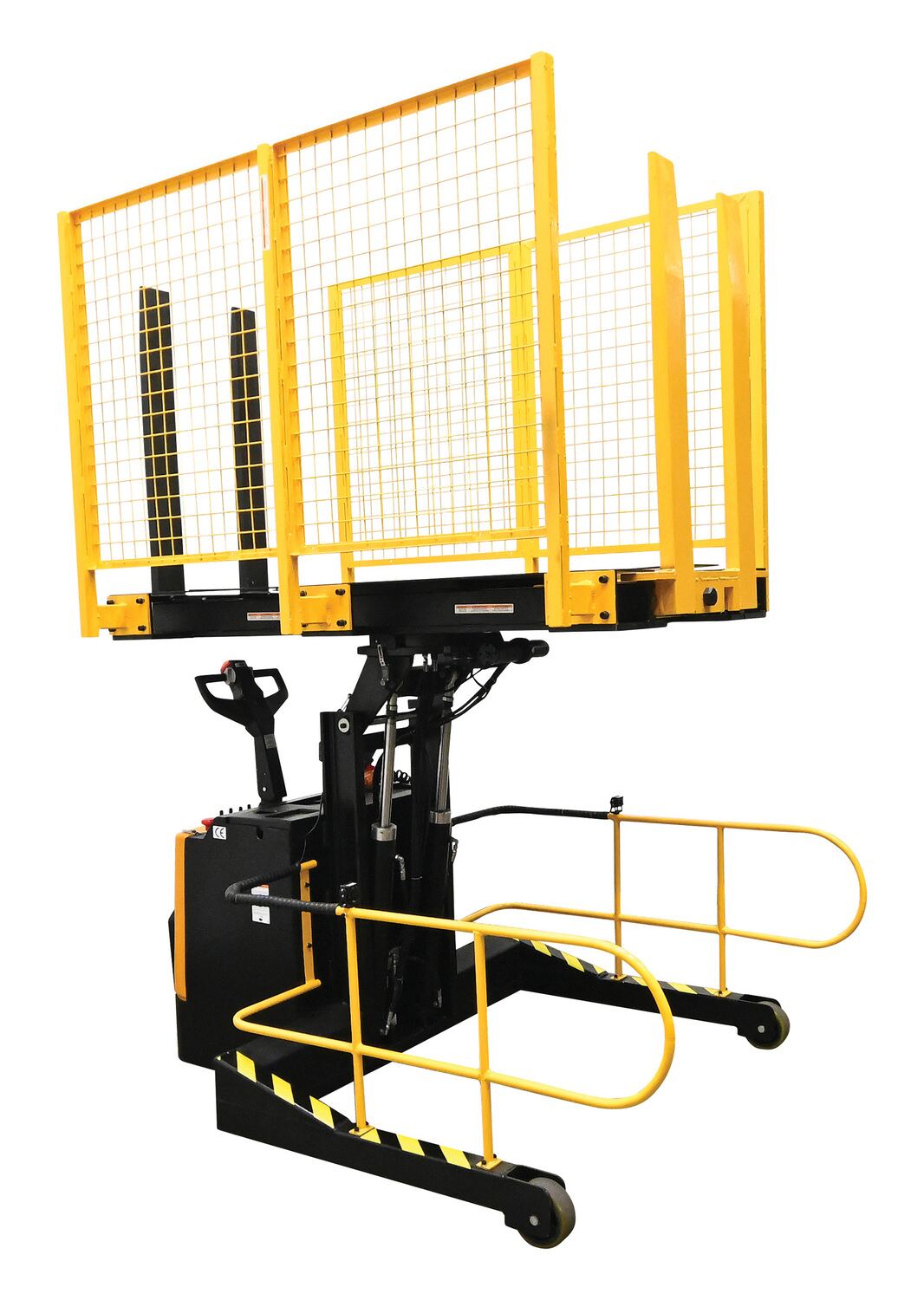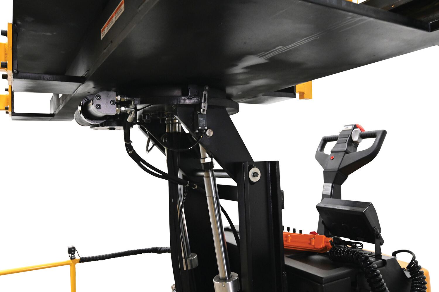 Tilt (powered) and rotate (manual) loads with our durable pallet inverter. Low profile design allows the operator to stand on the rider platform and steer the load from workstation to workstation quickly and easily. DC power lift and drive makes operation safe and efficient. The ergonomic handle features easy to operate throttle and tilt/lower controls. Features an electromagnetic disc brake with automatic dead-man feature that activates when user releases handle. Includes (4) 6V batteries, emergency battery disconnect, and horn. Ideal in loading dock areas as a powered pallet truck, powered pallet tilter, or as a manual turntable. Rolls smoothly on polyurethane steer and load wheels.