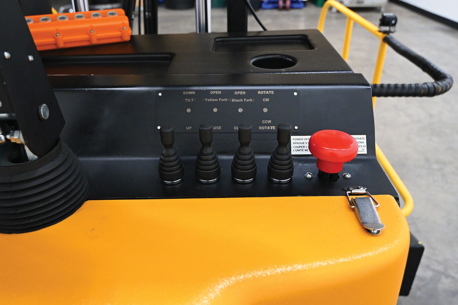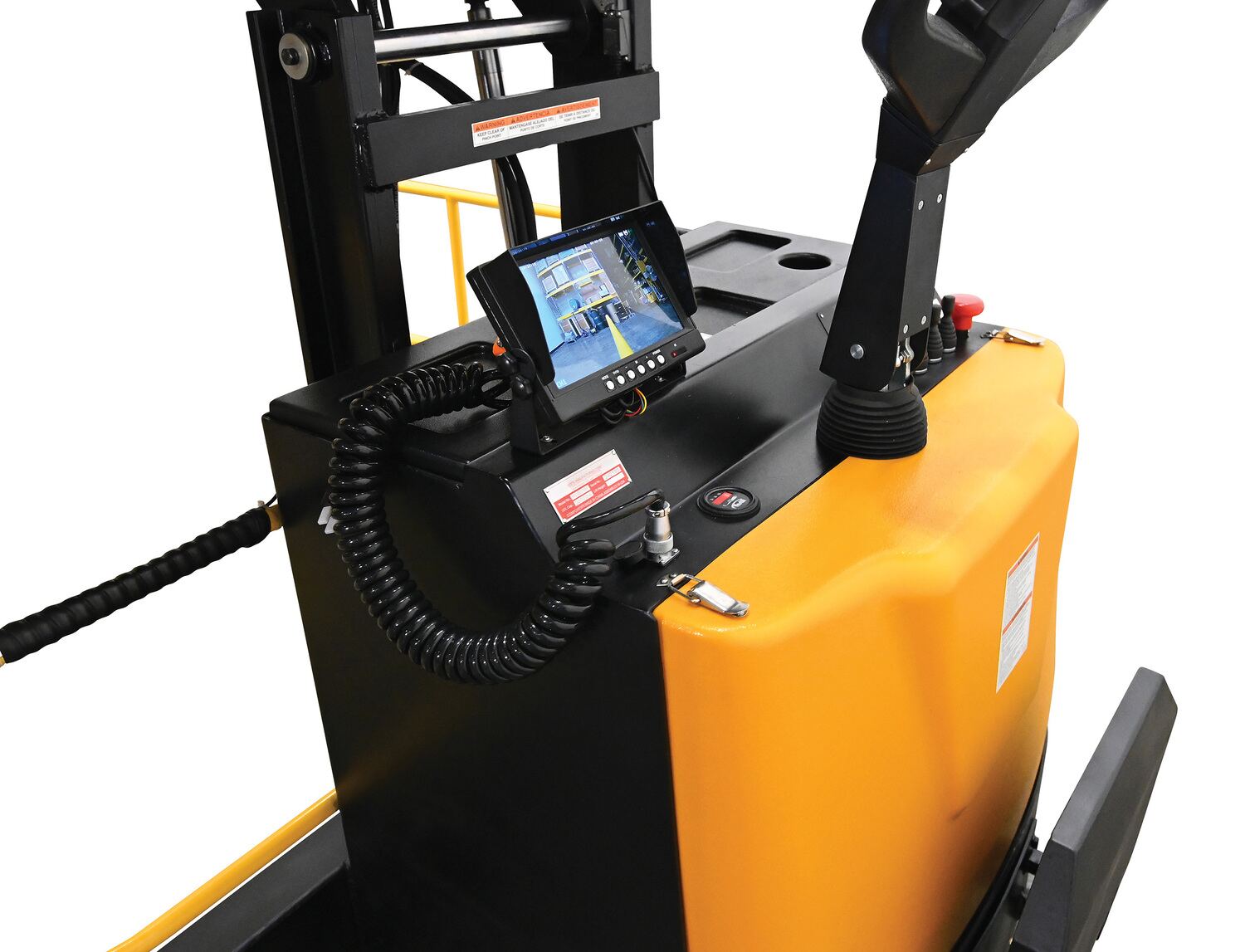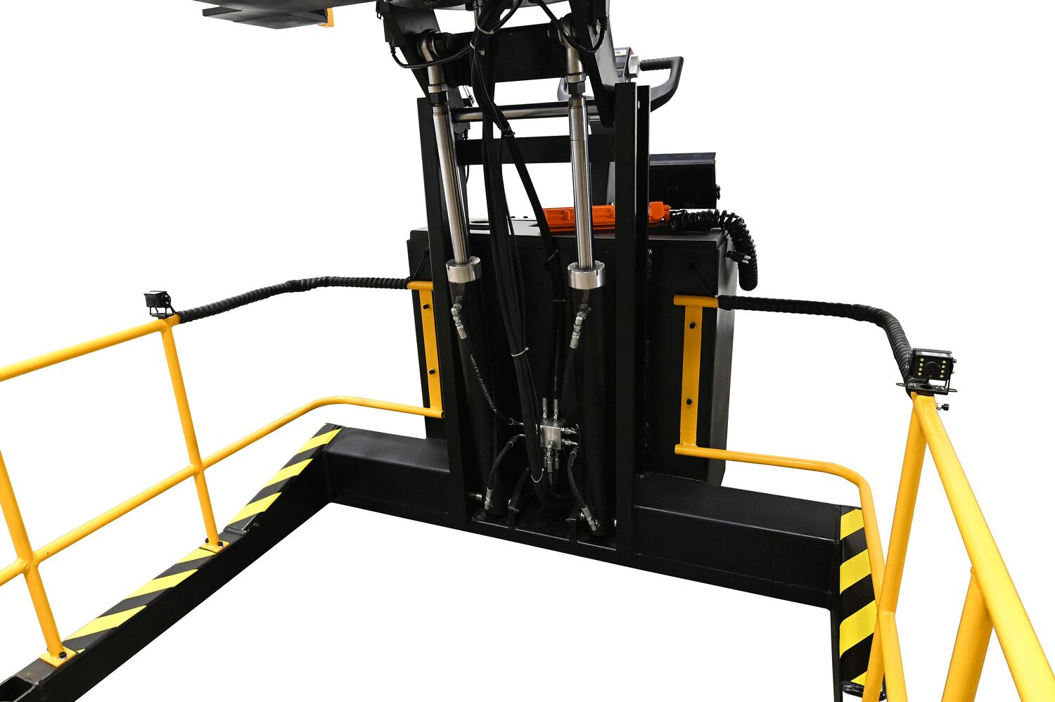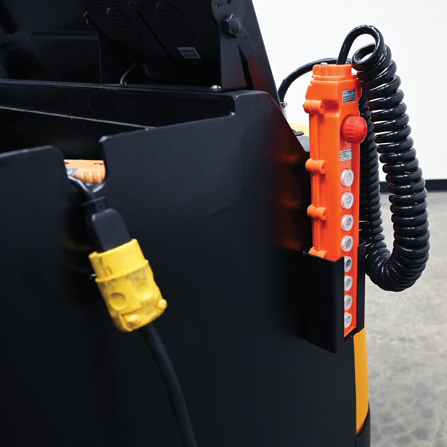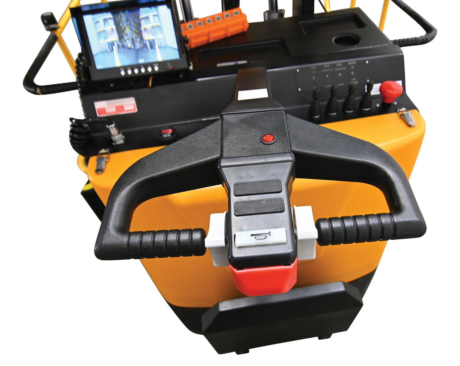 Tilt (powered) and rotate (manual) loads with our durable pallet inverter. Low profile design allows the operator to stand on the rider platform and steer the load from workstation to workstation quickly and easily. DC power lift and drive makes operation safe and efficient. The ergonomic handle features easy to operate throttle and tilt/lower controls. Features an electromagnetic disc brake with automatic dead-man feature that activates when user releases handle. Includes (4) 6V batteries, emergency battery disconnect, and horn. Ideal in loading dock areas as a powered pallet truck, powered pallet tilter, or as a manual turntable. Rolls smoothly on polyurethane steer and load wheels.