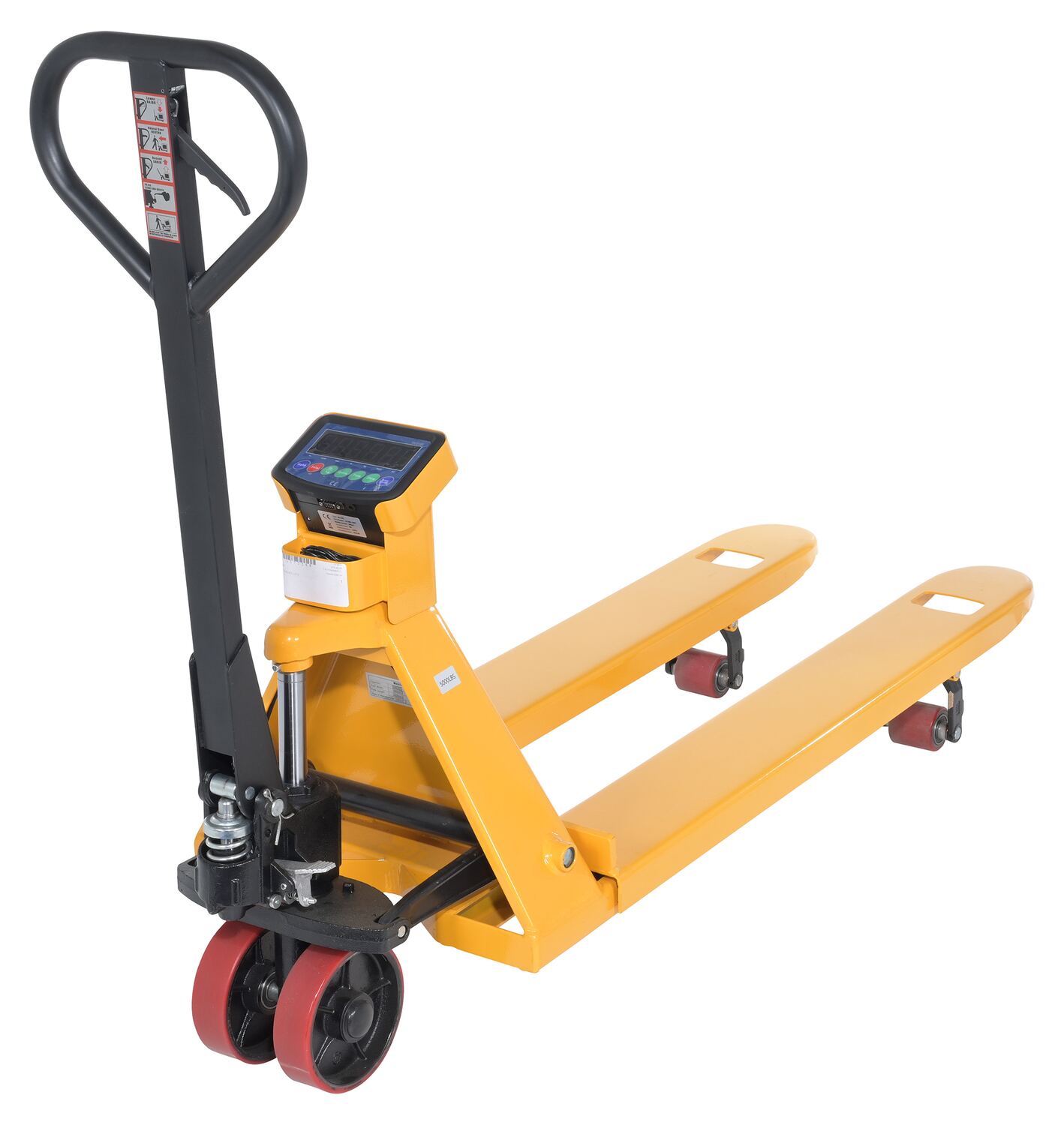 Steel Low Profile Economy Pallet Truck with Scale 67-1/2 In. x 20 In. x 47 In. 5000 Lb. Capacity YellowA low profile pallet truck is an economical way for one person to move heavy pallet loads without the use of a fork truck. With a scale included, items can be weighed and moved all in one unit. This brings efficiencies to warehouses and shipping areas, while bypassing the traditional time consuming weigh areas. The casters (two steer and four rollers) give the pallet truck quick movement and smooth turn-ability. The forks are built of steel and are powder coated yellow.