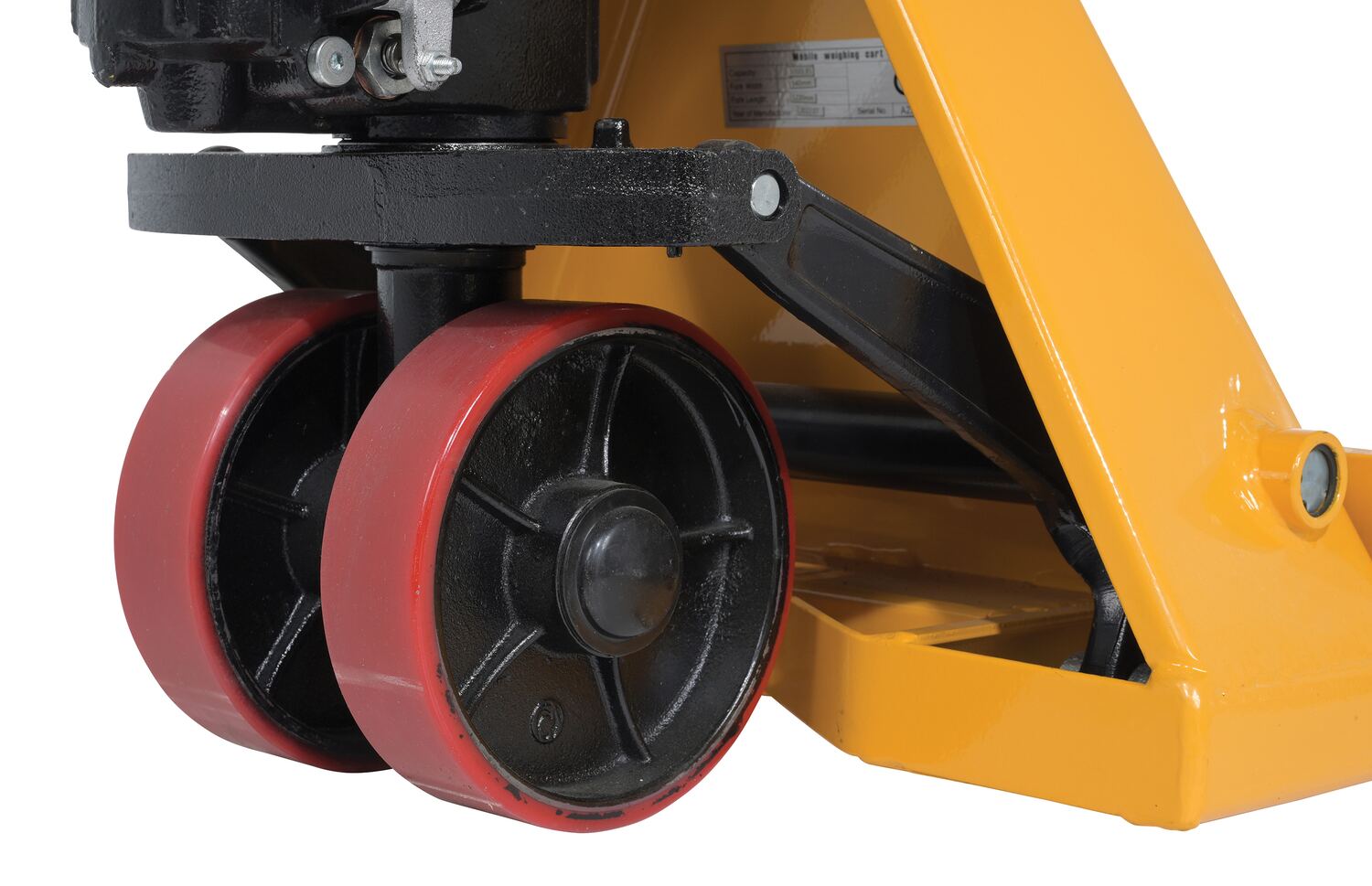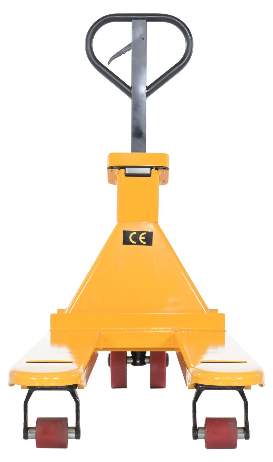 A low profile pallet truck is an economical way for one person to move heavy pallet loads without the use of a fork truck. With a scale included, items can be weighed and moved all in one unit. This brings efficiencies to warehouses and shipping areas, while bypassing the traditional time consuming weigh areas. The casters (two steer and four rollers) give the pallet truck quick movement and smooth turn-ability. The forks are built of steel and are powder coated yellow.