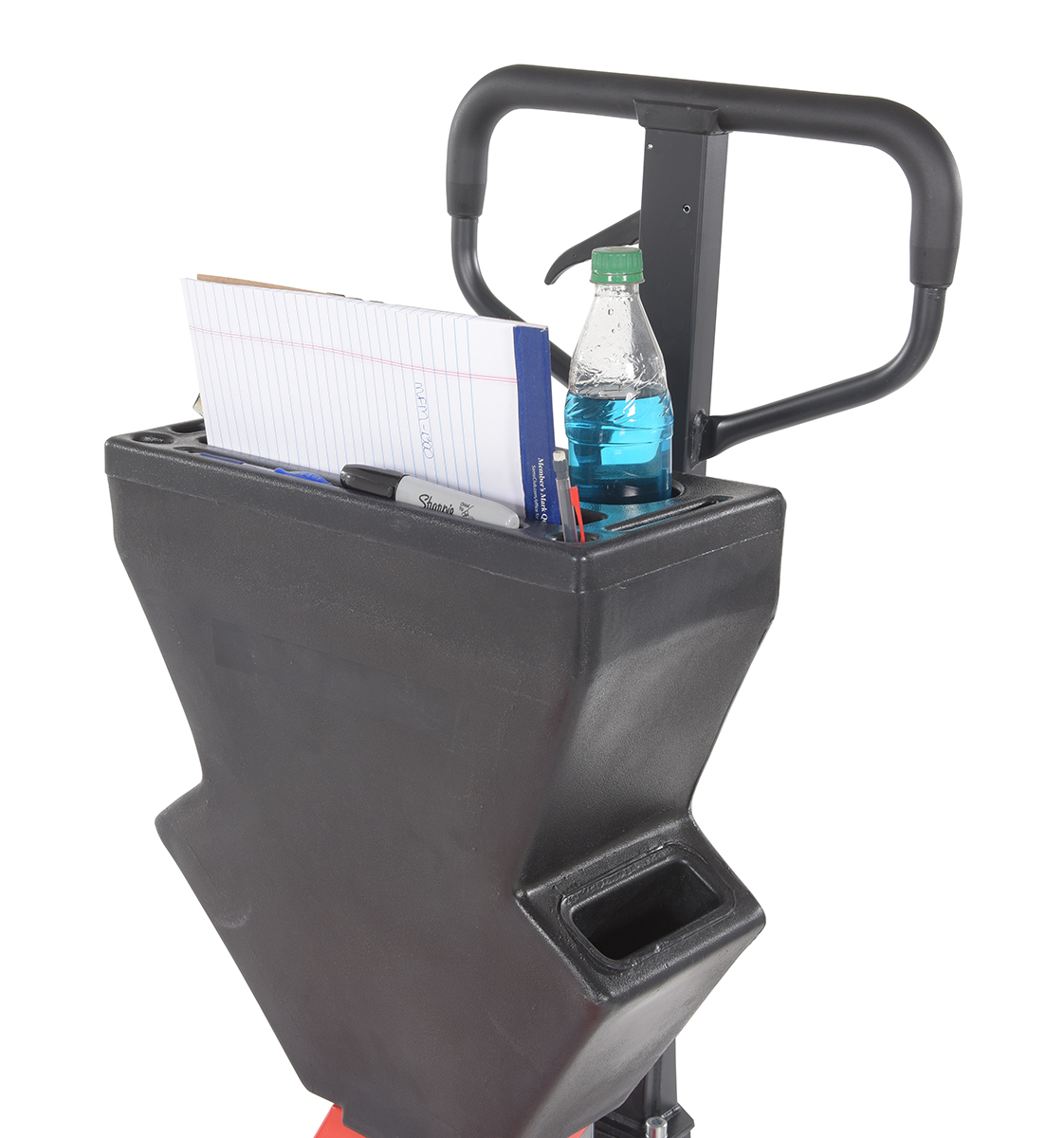 Steel/Plastic Pallet Truck 61-3/16 In. x 20 In. x 48 In. 5500 Lb. Capacity Red with Black P-CaddyA pallet truck with a storage caddy is the perfect bundle of two innovative products. The pallet truck has an ergonomically friendly design with a limited pulling force required, while the caddy allows the user to be more organized and efficient. With a strong powder coated steel construction, the pallet truck moves easily between areas. Nose wheels are located on the front edge of each fork to assist in clean pallet entrance and exit. A molded plastic design allows the caddy to be durable throughout consistent daily use. Installation hardware and instructions included.