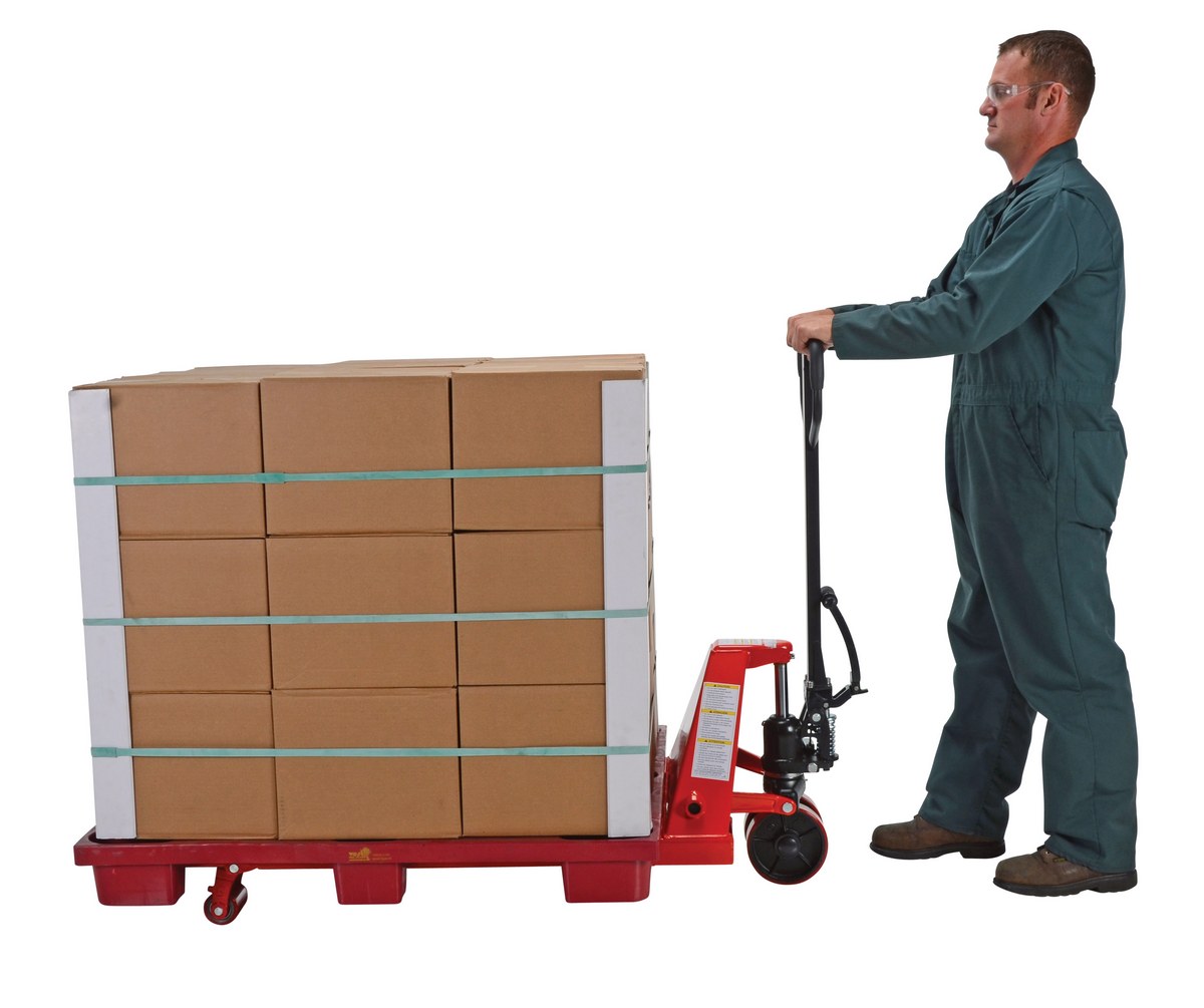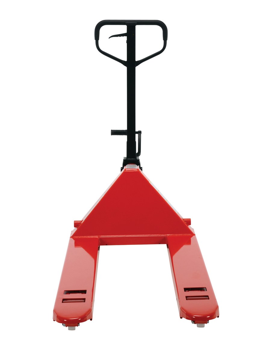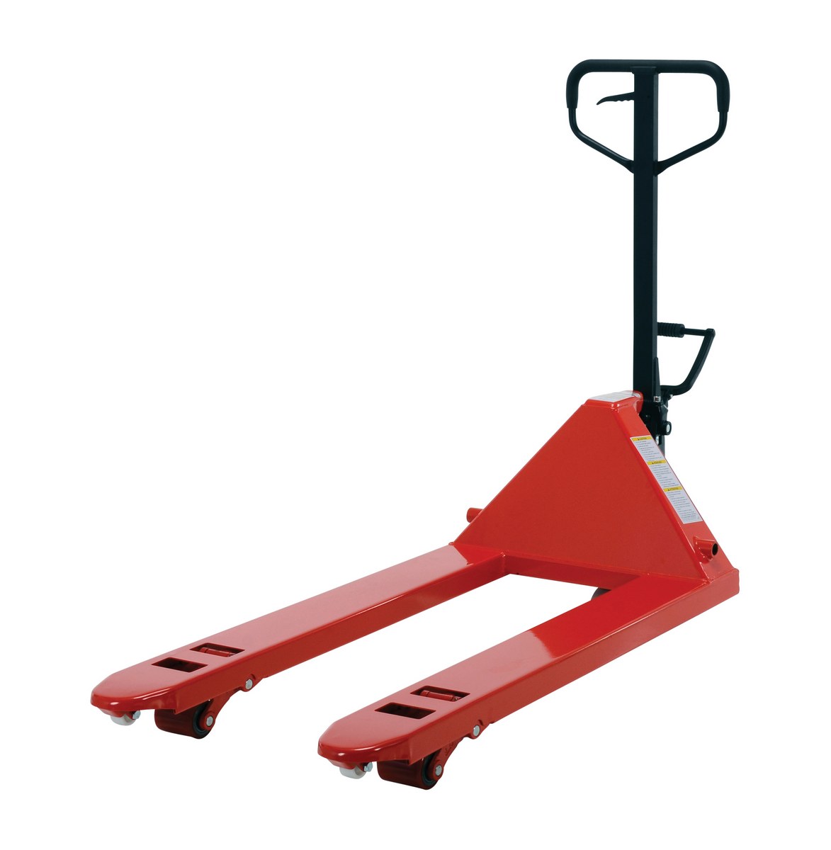 An economical way for one person to move heavy pallet loads without the use of a fork truck. The unit includes two articulating steering wheels and tow front loaders. The truck is raised and lowered with a foot pump mechanism. Ergonomic design requires only 75 lbs. of pulling force when fully loaded. Steering wheels include bearing dust covers for added life. Nose wheels are located on the front edge of each fork to assist in clean pallet entrance and exit. Reinforced triple-formed steel forks provide twice the strength of standard single-formed forks. The pallet truck is equipped with internally mounted solid steel adjustable push rods. Spring loaded handle automatically returns to vertical position when not in use. Hydraulic pump design facilitates easy access seal replacement.