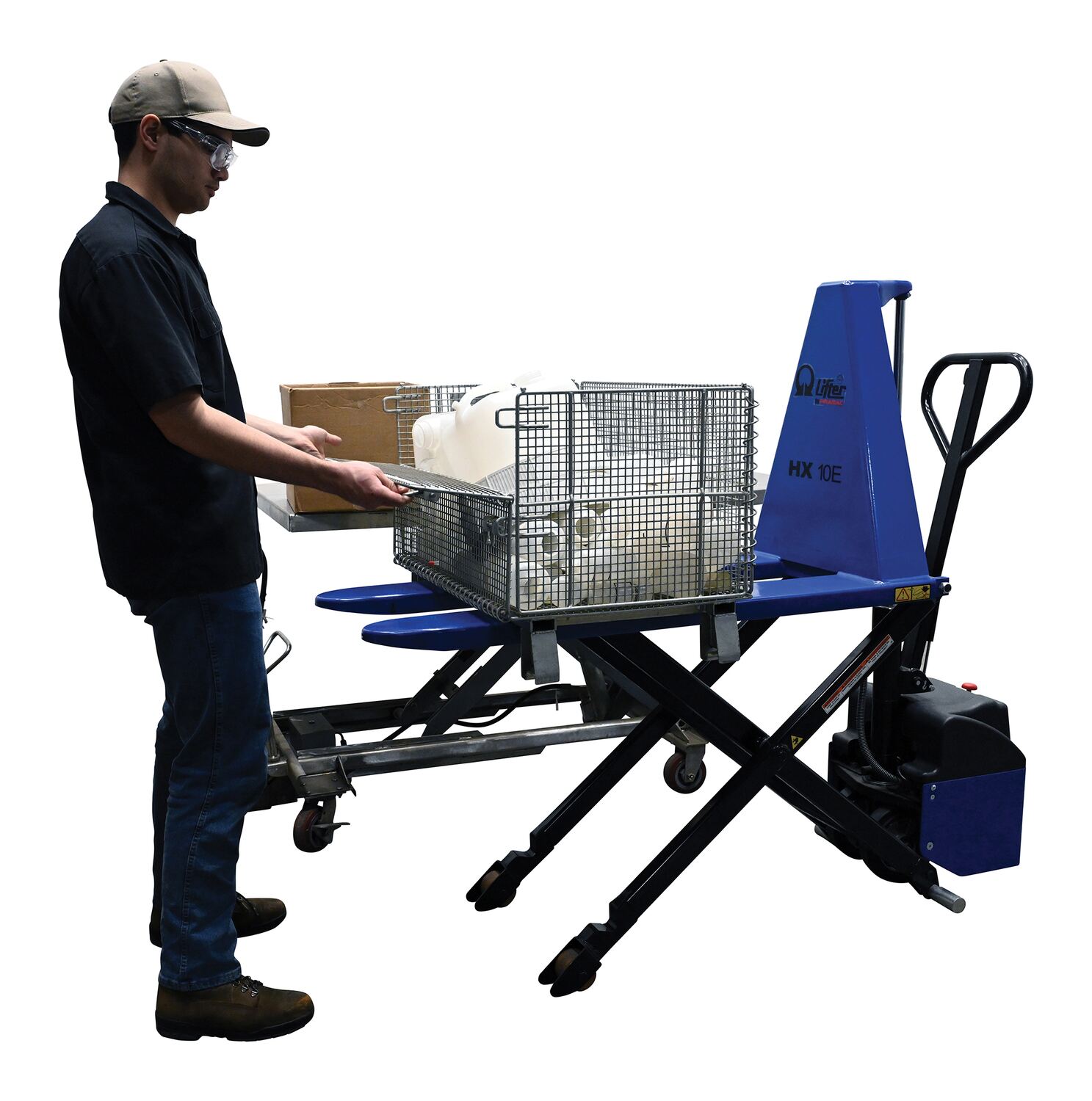 Steel Pramac DC Powered High Lift Pallet Truck 67 In. x 21-1/2 In. x 49-1/2 In. 2200 Lb. Capacity Blue/BlackThe portable high rise pallet lifter is ideal for the packaging and stocking departments. The unit is constructed of steel for strong support and durability during day to day use. The green color lends itself to clear visibility from across crowded workplaces. A push button can be utilized to cut off functionality of the pallet lifter in the case of an emergency. To use, simply slide forks of the unit through the pallet openings and lift to desired height.