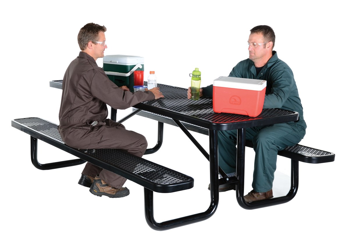 Steel Picnic Table Expanded Metal Rectangle Top 30 In. x 96 In. BlackBuilt to last and highly attractive, this commercial grade metal picnic table is constructed of expanded metal that features a diamond pattern. Finished to endure the elements with virtually no maintenance. Tops and seats are coated with a rugged thermoplastic layer that's attractive and durable. Galvanized tubular steel legs and supports are protected with a black powder coat finish designed for strength and stability.
