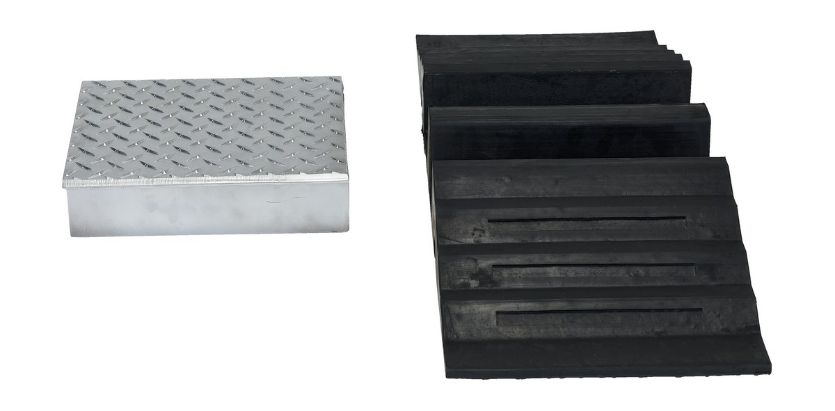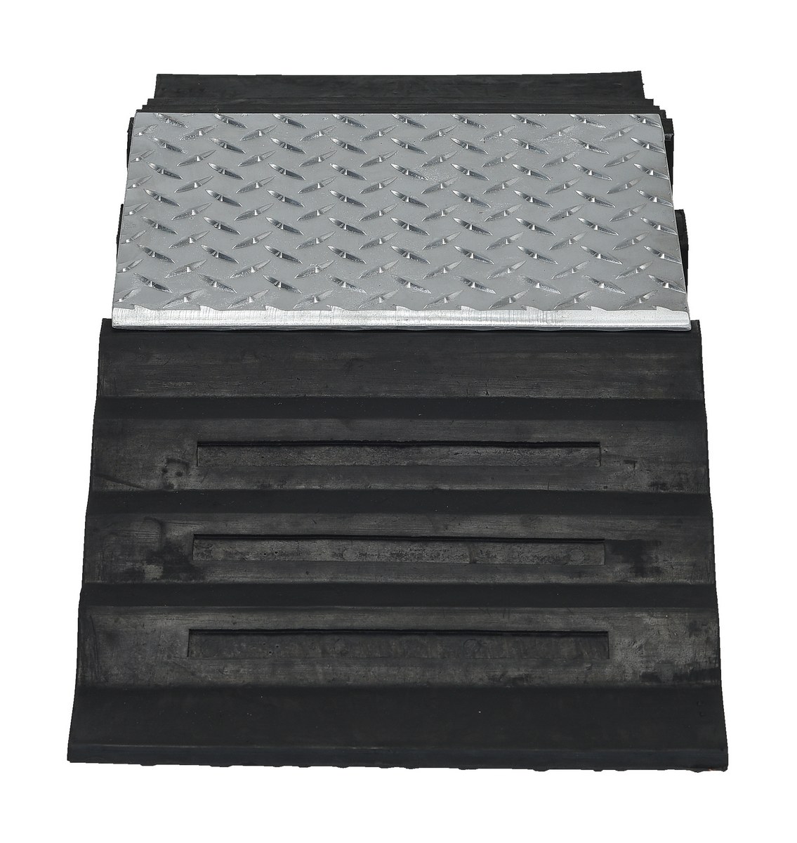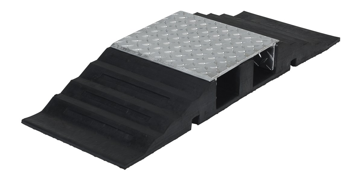 The molded rubber hose and cable Crossover is designed to protect cables and hoses from pedestrian and rolling traffic. The top surface of each crossover includes serrations for extra traction. Features an aluminum tread plate insert to protect hoses and cables (for light traffic and slow applications only). Optional connectors may be used to interlock individual units together to form wider crossovers. Simply lock together as many units as required.