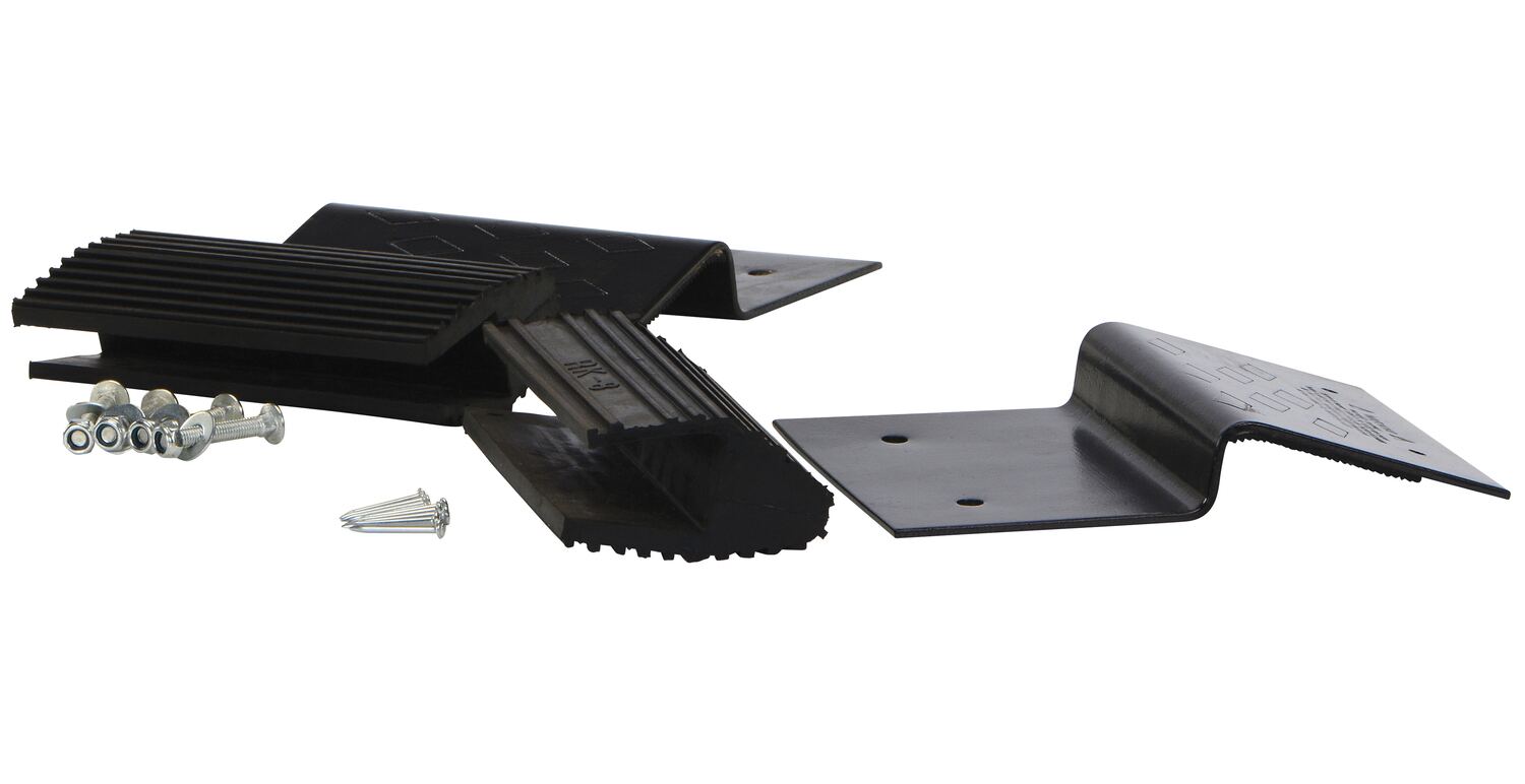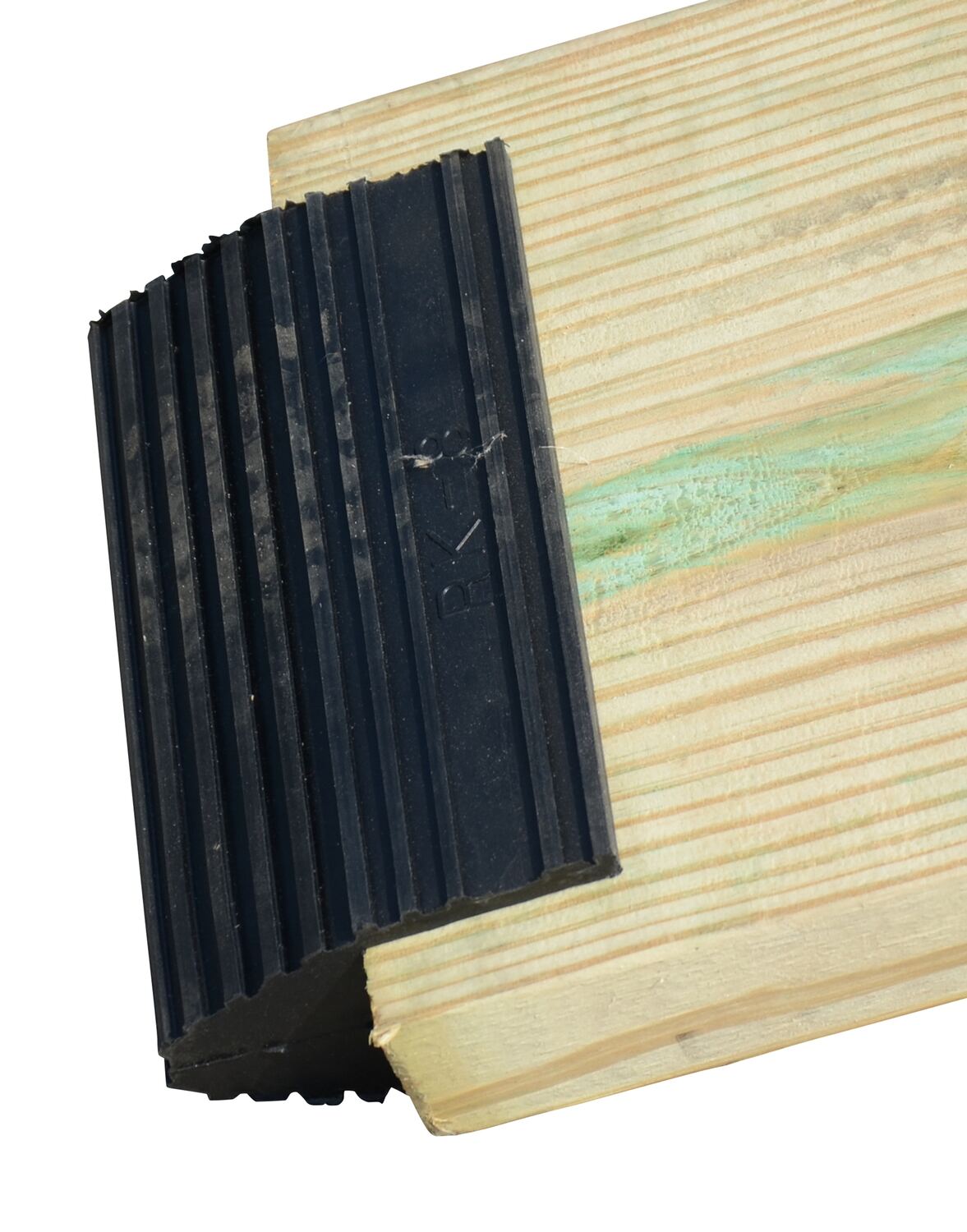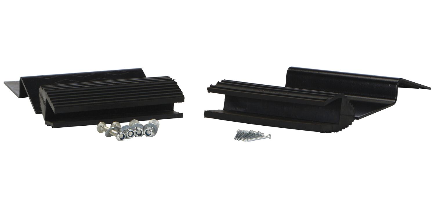 The wooden ramp kit allows building wooden ramps using common lumber. Each kit includes two (2) steel end plates and rubber bottom tips. Drilling required for installation. Lumber/boards are not included.