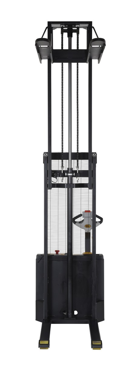 Steel Fixed Forks Double Mast Stacker 118 In. Raised Height 2200 Lb. Capacity Black / YellowDouble mast fully powered electric stacker transports loads throughout warehouse facilities quickly and with less effort. High torque drive and lift motor handles heavy-duty jobs. Ergonomic handle features easy-to-operate throttle with infinite adjustment of forward and reverse speeds, lift/lower controls, proprietary safety-enhancing emergency reverse function, and horn. Includes an electromagnetic disc brake with automatic dead-man feature that activates when user releases the handle. Powered lifter has two lead acid deep cycle batteries. .A battery charger, gauge and horn are included. Stacker rolls smoothly on poly-on-steel steer and load wheels. 3-4 hour operation at full charge - 8 hours when used intermittently.
