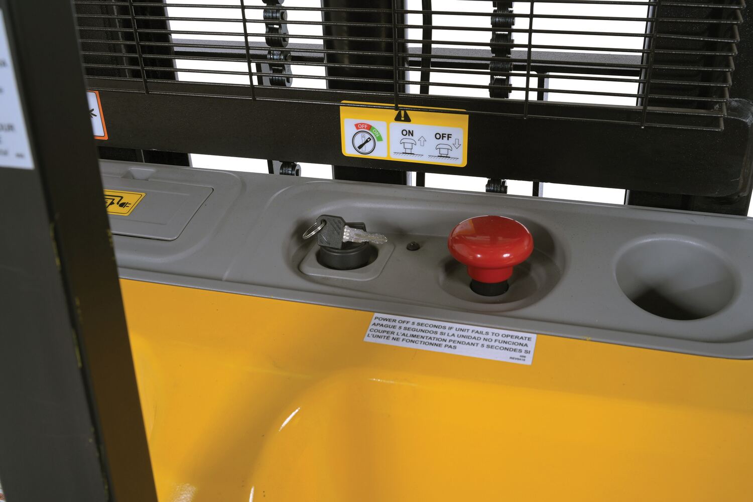 Steel Adjustable Double Mast Stacker 118 In. Raised Height Variable Speed 2200 Lb. Capacity BlackThe double mast fully powered electric stacker transports loads throughout warehouse facilities quickly and with less effort. High torque drive and lift motor handles heavy duty jobs. Ergonomic handle features lift/lower controls, proprietary safety enhancing emergency reverse function, and horn. The unit includes an electromagnetic disc brake with automatic dead-man feature. Powered lifter has two 12V lead acid deep cycle batteries, integral battery charger, and a battery level gauge.