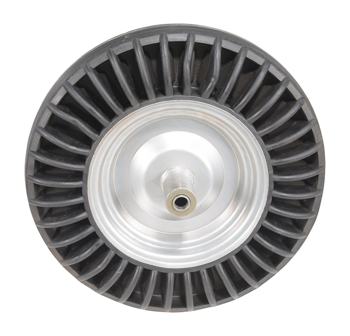 This shock-absorbing wheel with special design for shock absorption properties prevents wheels from bouncing like standard pneumatic wheels. Solid black molded rubber tread will never go flat. Steel hubs (symmetric style for wheel barrels) for maximum strength and precision bearings.
