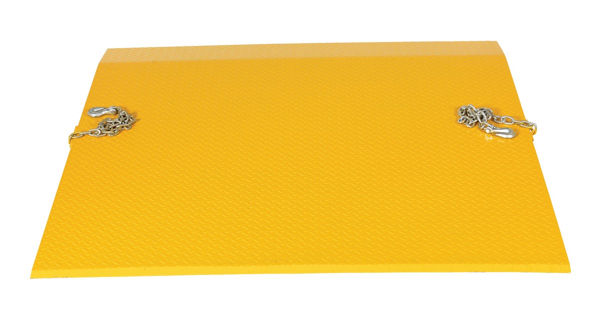 Steel Truck Dock Plate 60 In. x 60 In. x 12-5/8 In. 5,500 Lb. Capacity YellowThe steel truck dock plate is constructed of high strength INX-55 (55,000 psi) steel. Safety locking legs prevent slippage between truck and dock. Safety tread plate helps provide positive traction. Beveled edges for smooth entry and exit. Chain pickup comes standard. Designed with an 11 degrees bend located 9" from the beveled edge. The legs are 10" from the beveled edge. Manufactured in compliance with OSHA. When using three wheeled pallet trucks, select capacity +20% due to concentrated load center of board.