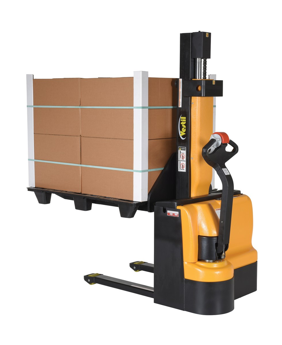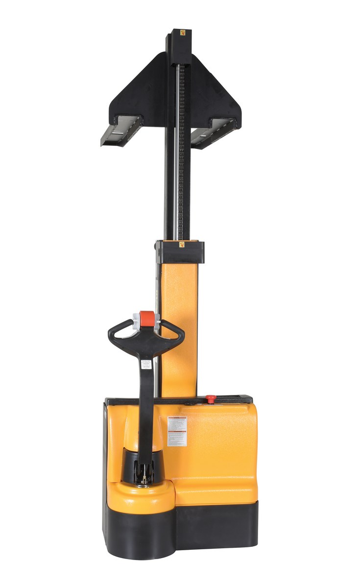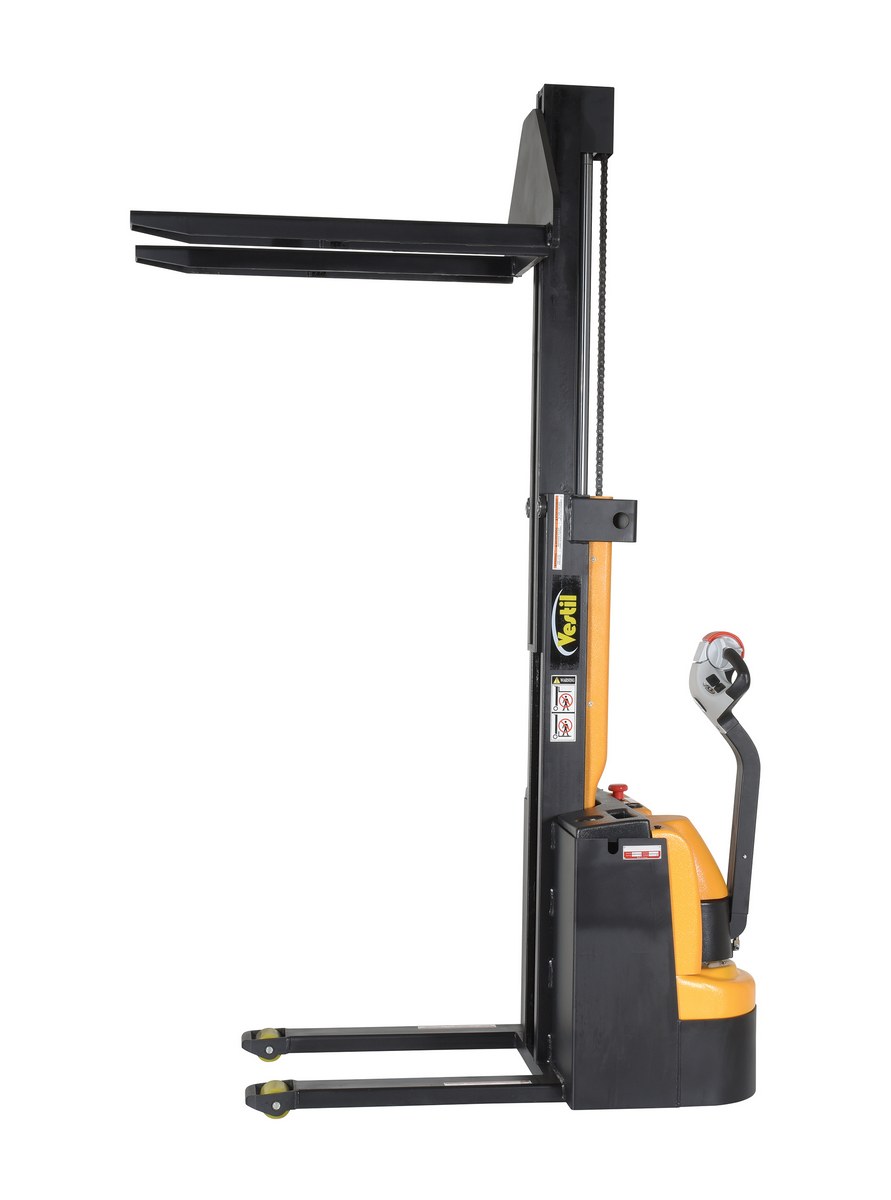 Steel Narrow Mast Stacker DC Powered 90 In. Raised Height Fixed Fork 27 In. Fork Width 2,500 Lb. Capacity Black / YellowThe narrow mast stacker is great for the shipping and manufacturing facilities. The stacker provides a fast efficient solution to loading and unloading products in closely confined areas. The stacker features a simple throttle design for lifting control, as well as, infinite forward and reverse speed adjustments. The unit drives on poly on steel steering and load wheels, which provide excellent maneuverability. A battery charger, gauge and horn are included. Models are available with fixed or adjustable forks as well as fixed or adjustable leg supports.