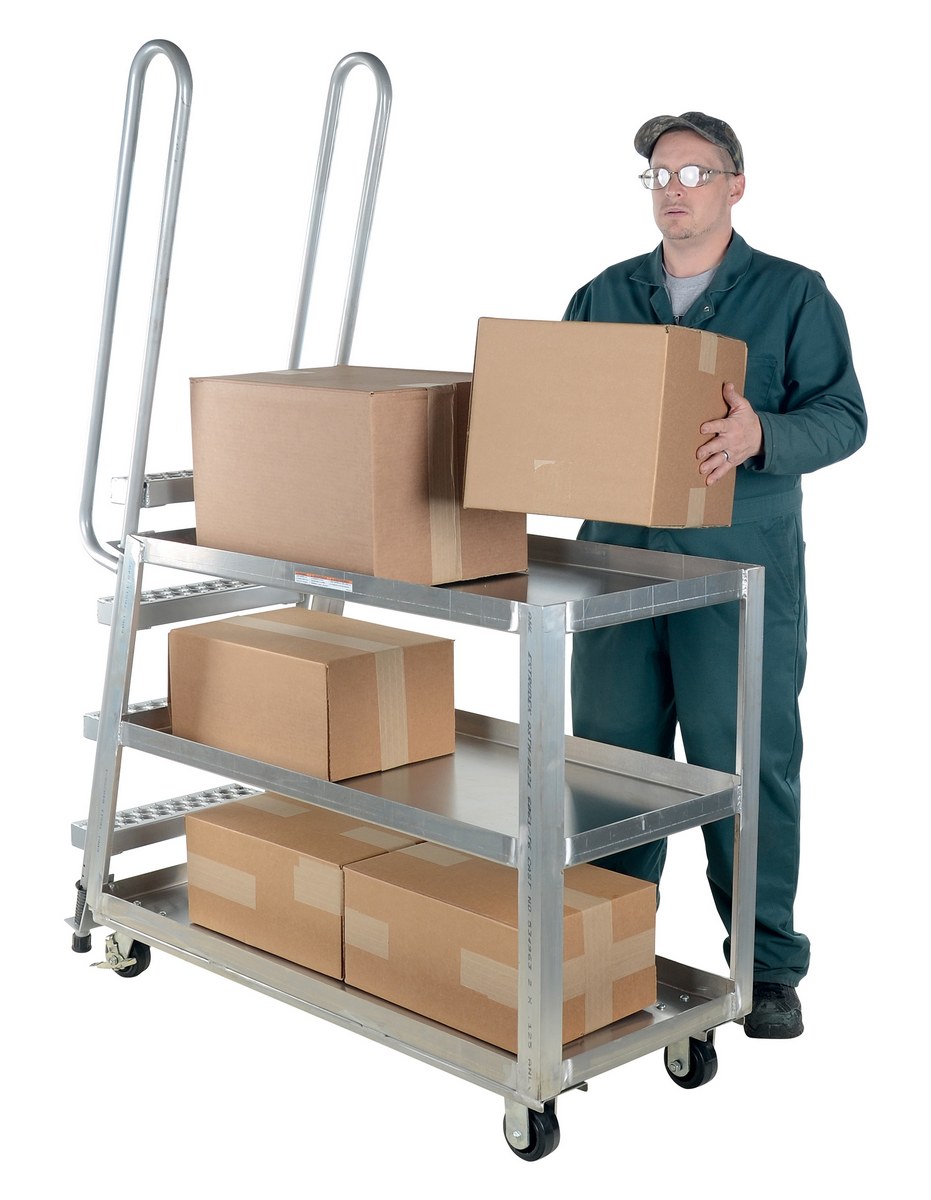 Aluminum High Duty Stock Picker Truck with Steel Ladder 56 In x 21-7/8 In x 73-5/16 In 500 Lb. CapacityThis oversized hi-duty stock picker truck is perfect for large jobs. Ideal for oversized cartons, boxes, parts, and supplies. A spring loaded steel ladder for sure, safe climbing, and loading. Steps have non-skid footing with self-cleaning surface. Each unit features three (3) shelves. Ladders have a baked in silver powder coated finish.