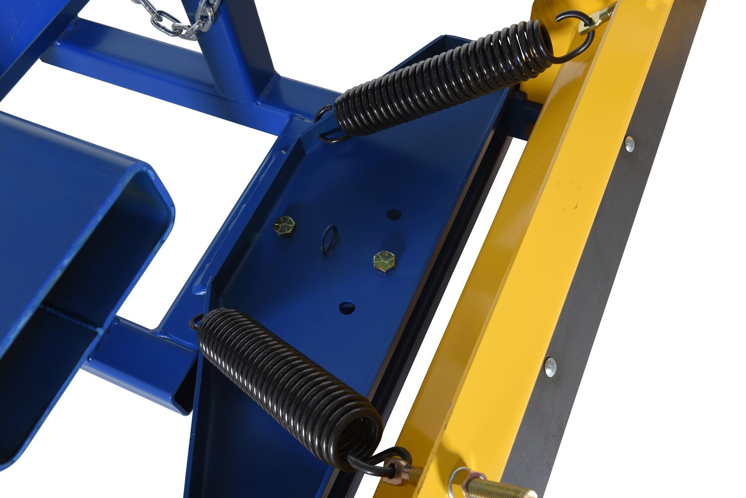 Steel Snow Plow Fork Mounted Push Box 72 In. Blade Width Blue / YellowUnique design attaches to fork truck forks. Pass through fork tubes keep weight back towards fork truck mast. Locking pins secure snow plow to forks for safety. The steel construction has a brightly colored baked-in powder-coated finish for added toughness and clear visibility. The attached sides contain the snow in a direct manner for time and safety efficiency.