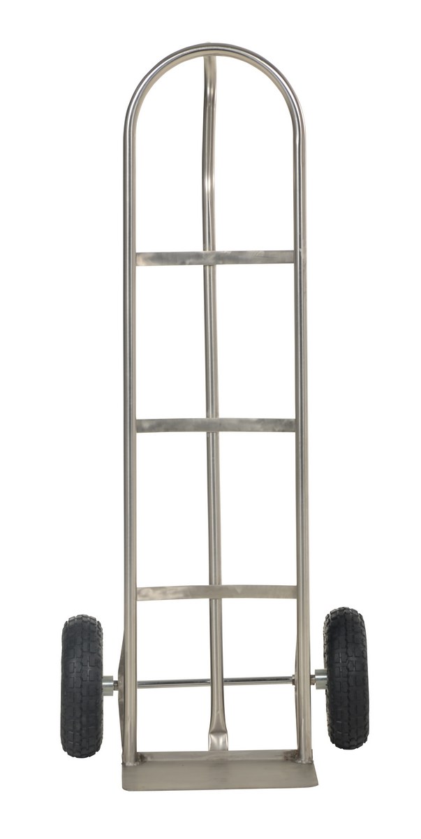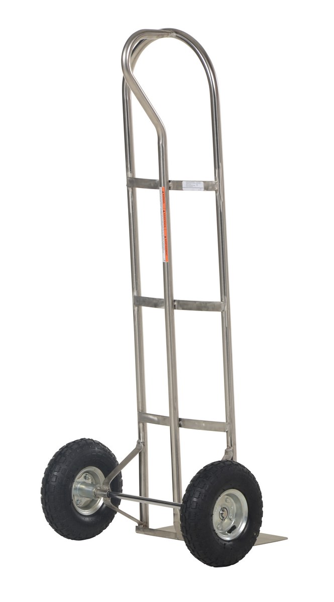 The "P" handle Hand Truck is ideal for transporting heavy and awkward loads. This truck works well for the user that needs to free up one hand. The "P" shaped handle makes the truck easy to steer and maneuver. Axle and wheel hub not stainless steel.