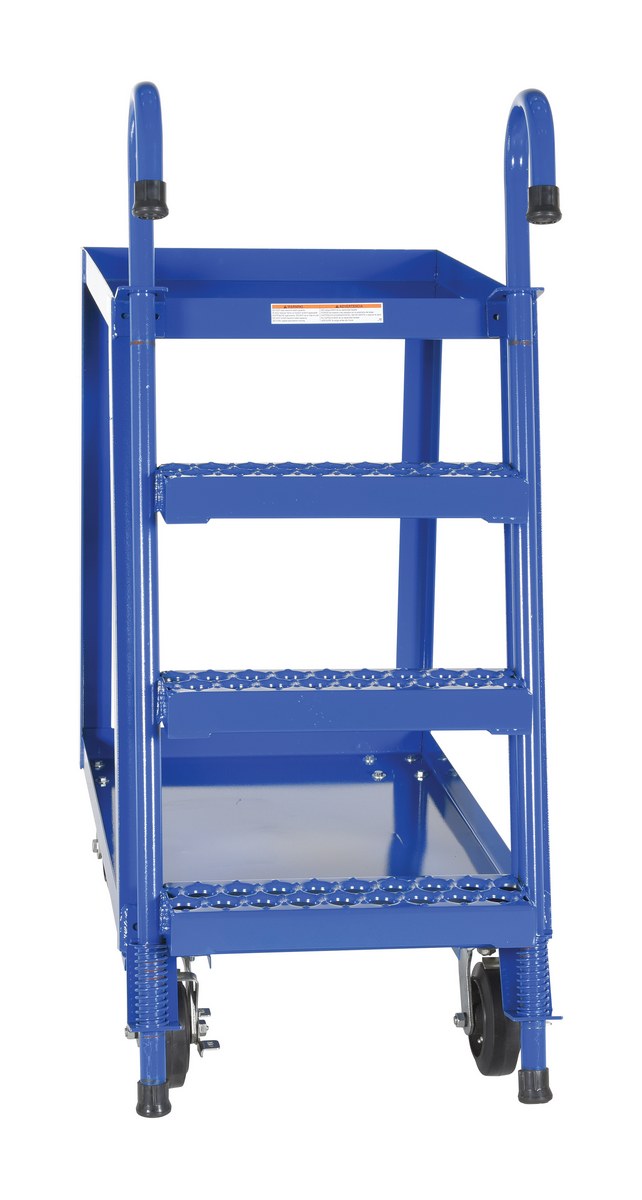 Steel Stock Picker 2 Shelf with Rubber On Steel Casters 39-3/4 In. x 21-7/8 In. x 50-1/8 In. 1,000 Lb. Capacity BlueCombine the mobility of a cart with the versatility of a step ladder with this stock picker truck. Convenient spring loaded steel step ladder holds the cart securely in place while a person is standing on the ladder. Crutch tip ladder prevents the cart from moving while stocking. Springs then return the ladder to the raised position once personnel exit the step. All shelves have the lip turned up to prevent items from falling off.