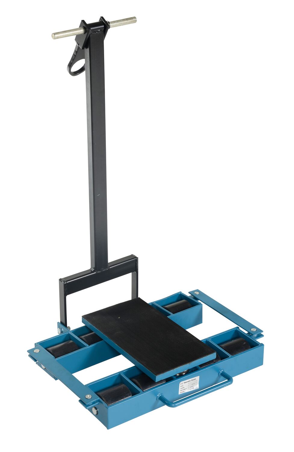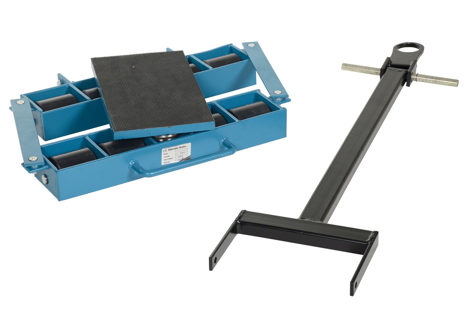 Steel Machinery Skates 8 Nylon Rollers 6 Ton Static Capacity BlueThis machinery skate is designed to move heavy equipment and machinery. Nylon wheels are strong and will not mark floors. The top of each skate includes a rubber surface for extra grip. Steel construction with handle to carry and position. With the steerable skate model each dolly includes a swivel top plate and a pulling bar to allow for easy maneuvering around turns and corners.