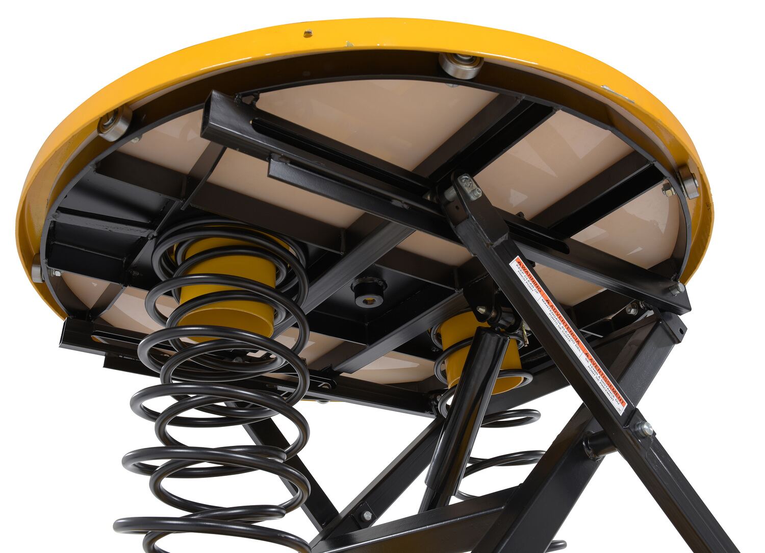 The spring scissor table is ideal for distributing and shipping facilities. The unit allows the user to transfer products from work space to work space, while holding an ergonomically friendly position. The frame is designed of a steel construction, which allows for strength and durability. The scissor mechanism raises the unit to the desired height, while the internal spring provides support when unit is being loaded and unloaded. The round top can be manually rotated 360 degrees for improved packaging and handling capabilities.
